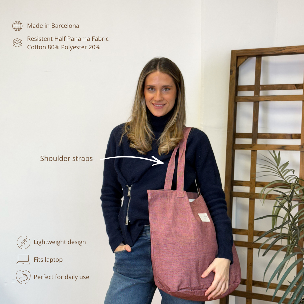 Bolsa shopper grande con tejido liso color vino, amplia y resistente para acompañarte en el día a día. Con asas cómodas para llevar al hombro y gran capacidad para compras, trabajo o playa. Confeccionada en España.