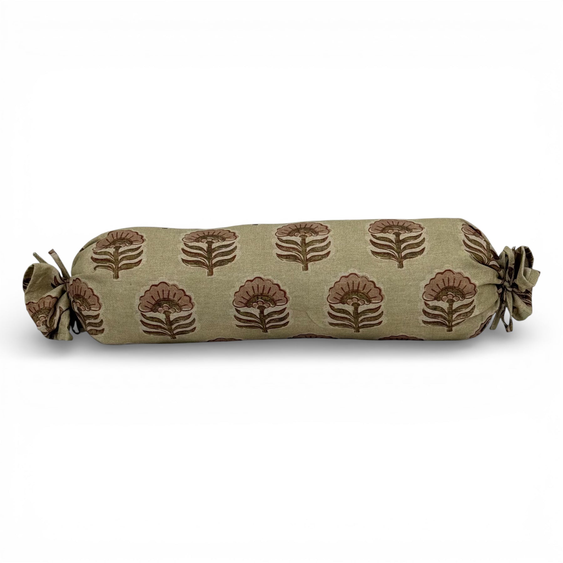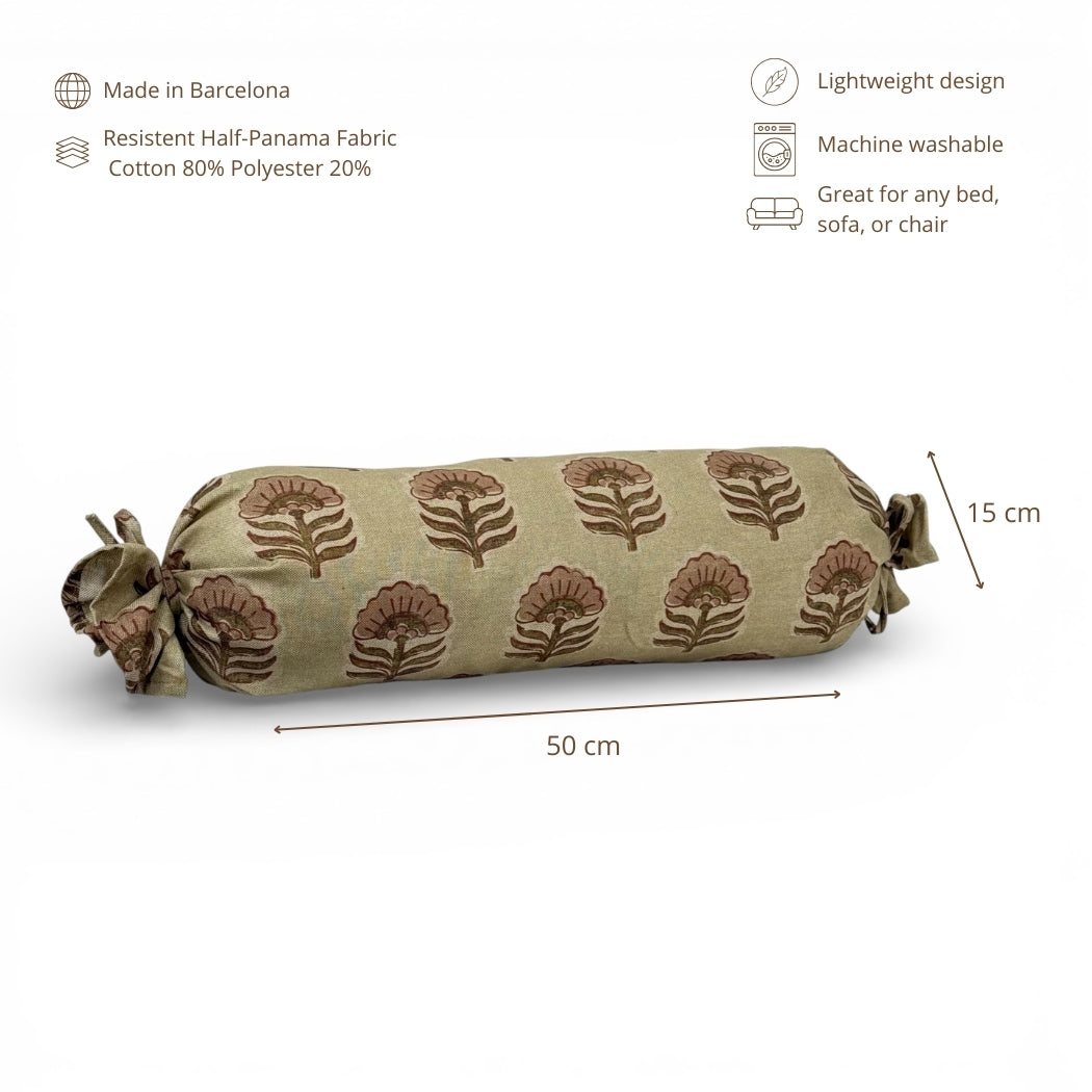 Cojín caramelo con relleno, confeccionado en tejido fino de half-panama 80% algodón y 20% poliéster de gran calidad con estampado floral en tonos rosa y granate sobre fondo beige tostado. Un diseño con textura y personalidad que aporta calidez y un toque especial a cualquier espacio.