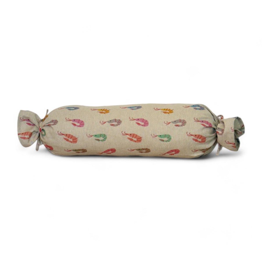 Cojín caramelo con relleno. Con tejido fino de half-panama con estampado de gambas de multicolor. Para su correcto mantenimiento se aconseja lavarlo en frío y no utilizar secadora.