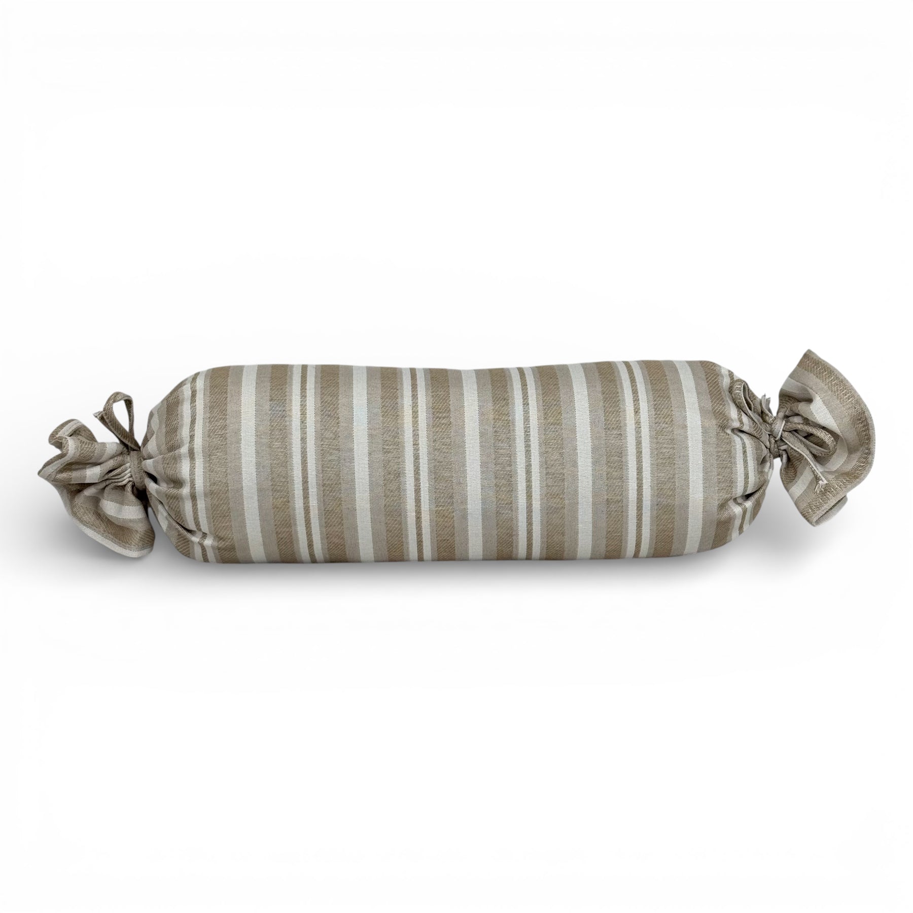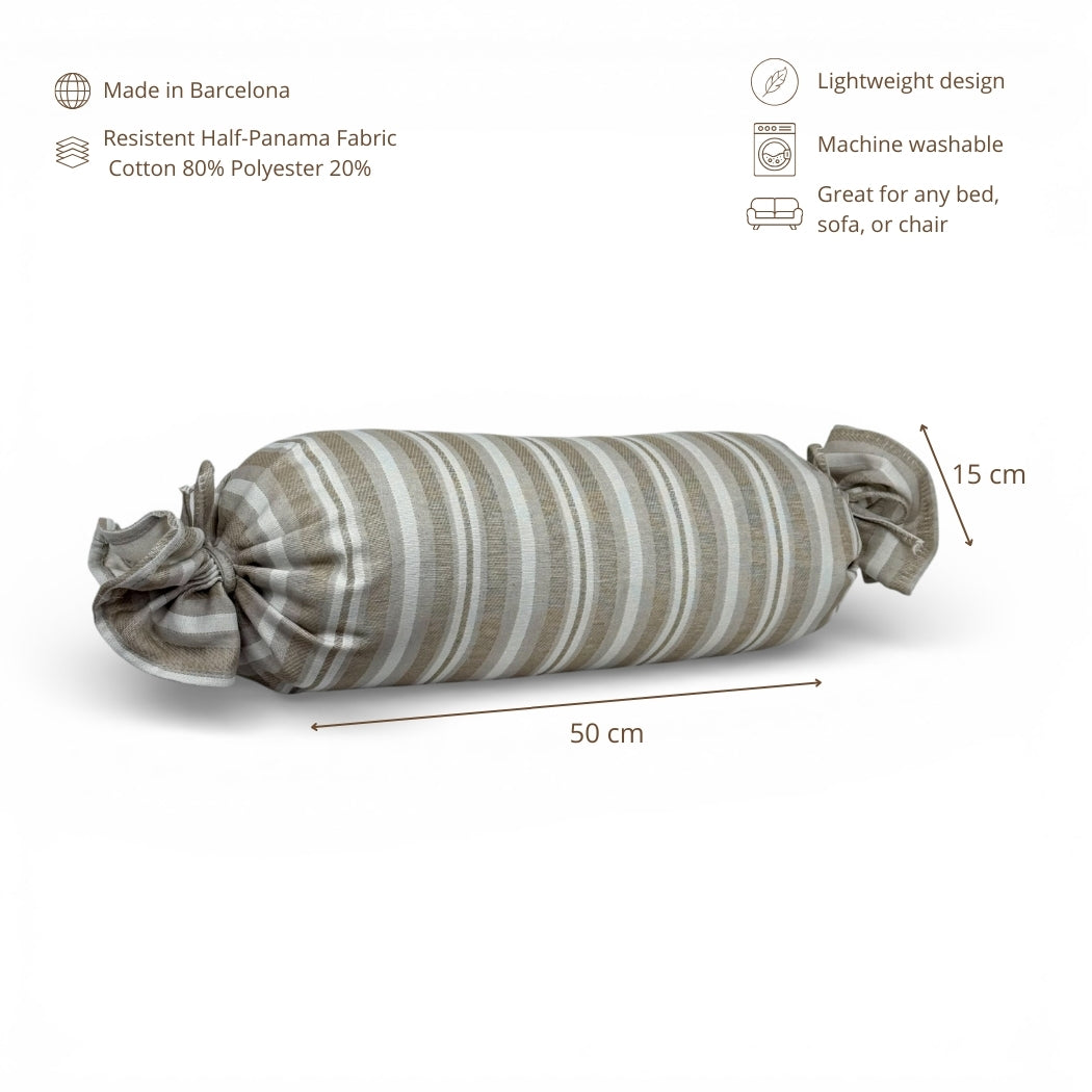 Cojín caramelo con relleno, confeccionado en tejido jacquard 80% algodón y 20% poliéster de gran calidad con estampado a rayas en tonos beige y crudo. Un diseño con textura y personalidad que aporta calidez y un toque especial a cualquier espacio.