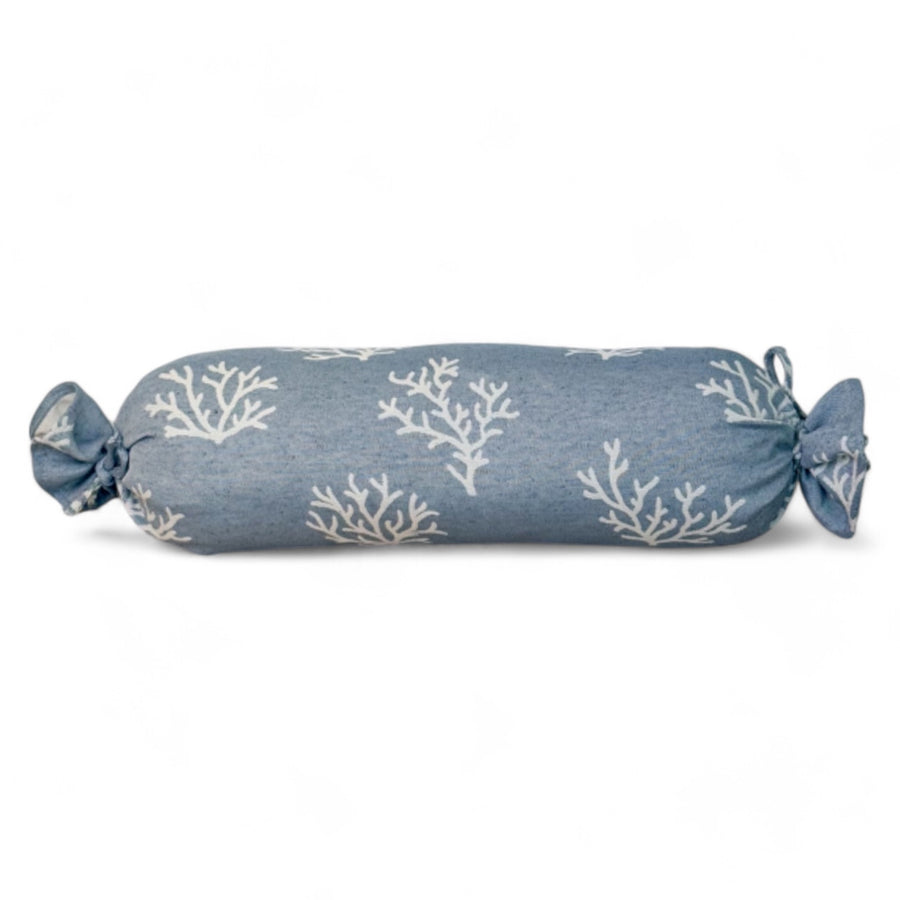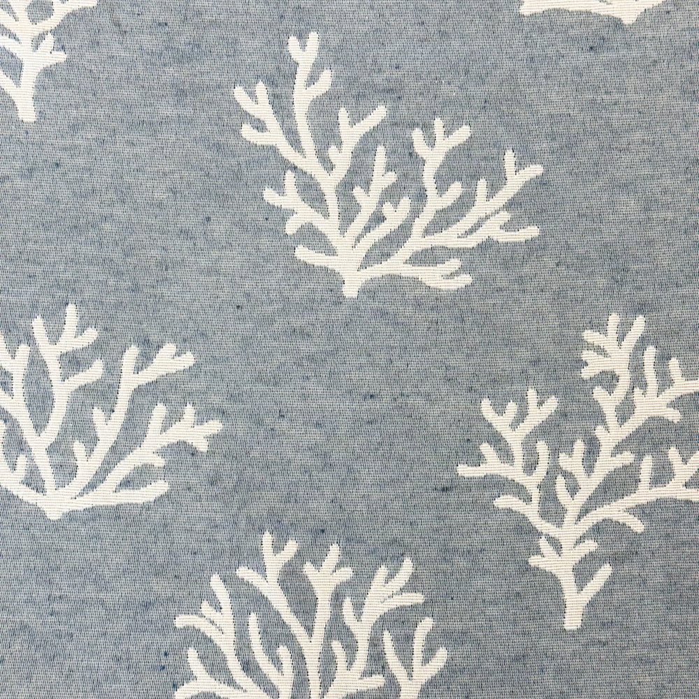 Cojín caramelo con relleno. Con tejido grueso de jacquard con estampado de coral de color crudo sobre fondo azul. Para su correcto mantenimiento se aconseja lavarlo en frío y no utilizar secadora.