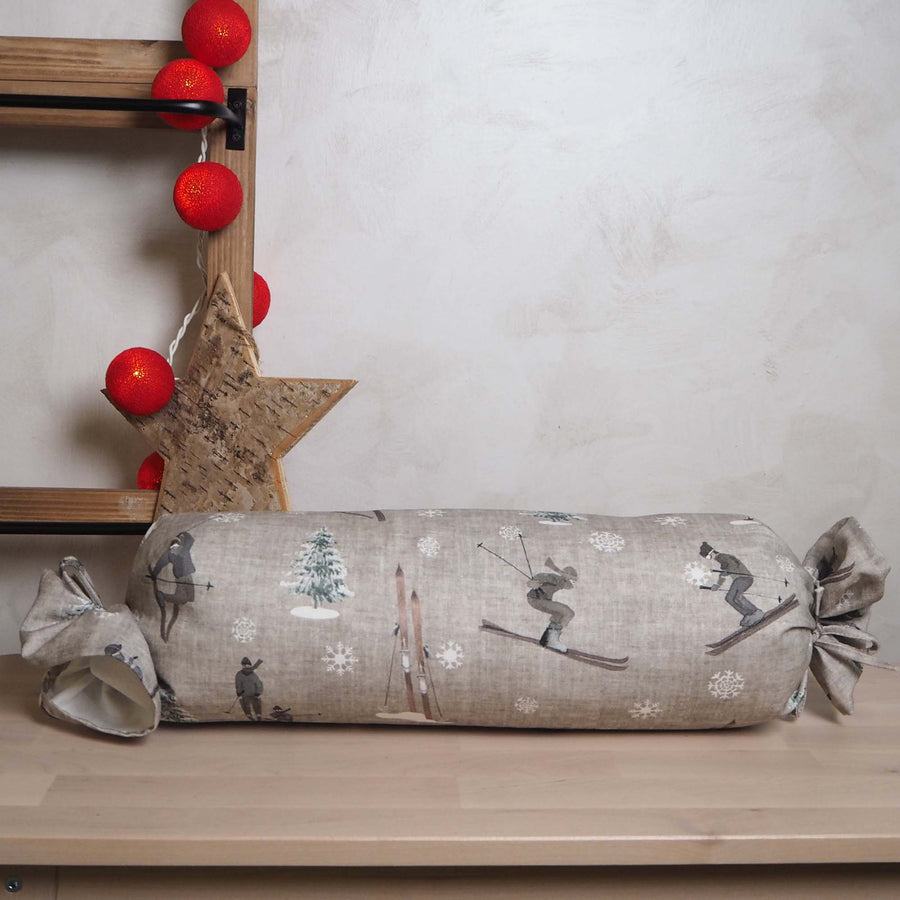 Cojín caramelo con relleno. Con tejido fino con estampado de esquí. Para su correcto mantenimiento se aconseja lavarlo en frío y no utilizar secadora.