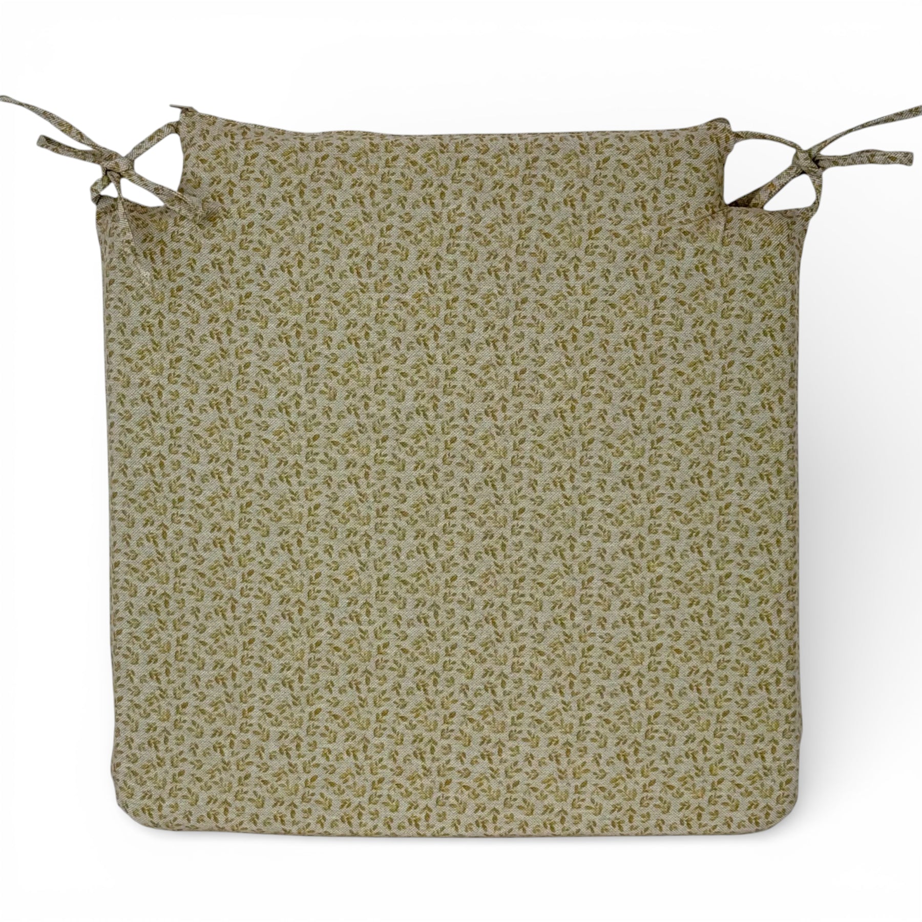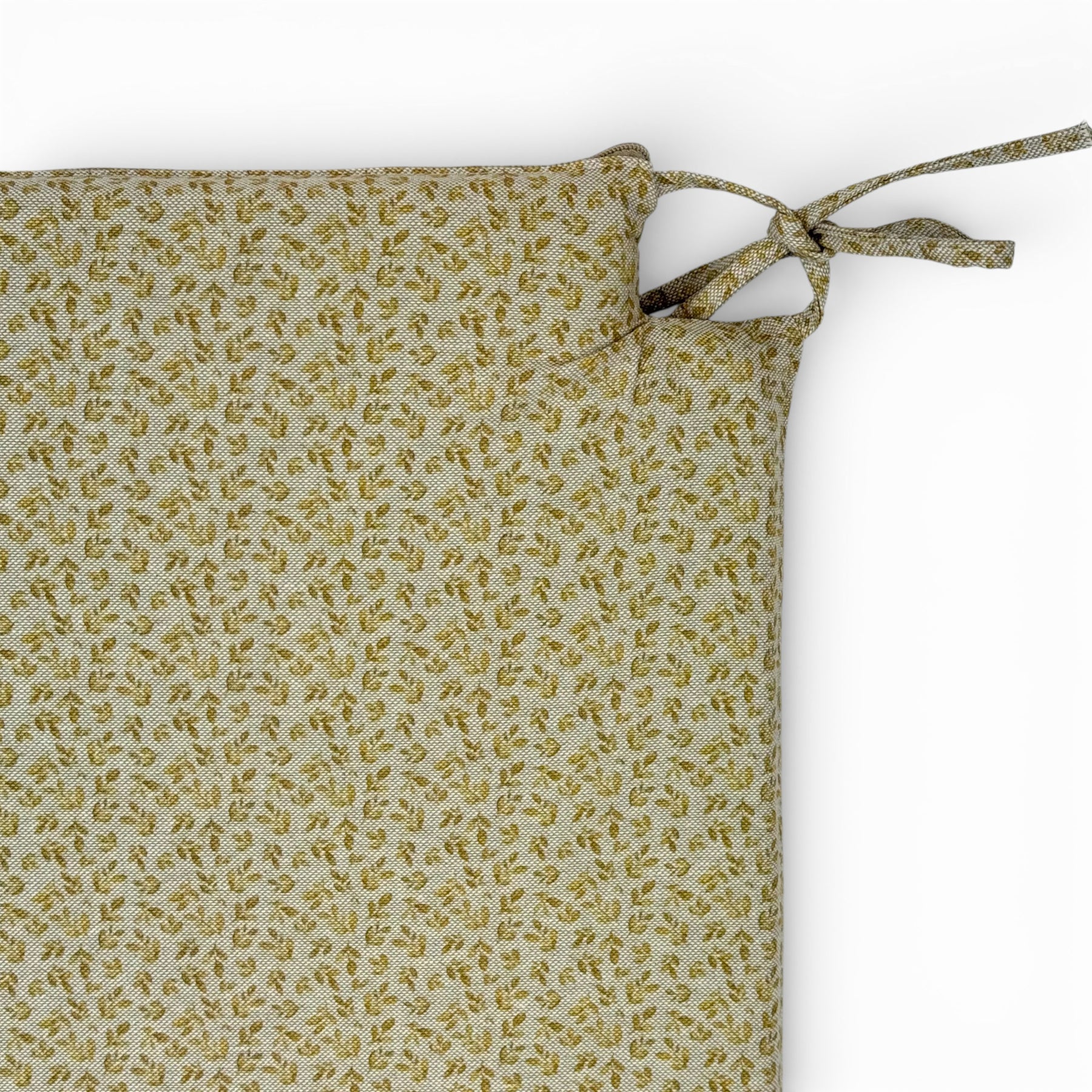 Cojín cuadrado para silla con encajes, relleno incluido y cintas para atarlo fácilmente. Está confeccionado en tejido fino de half-panama 80% algodón y 20% poliéster, de gran calidad, con estampado floral mostaza, que aportan luz y calidez.