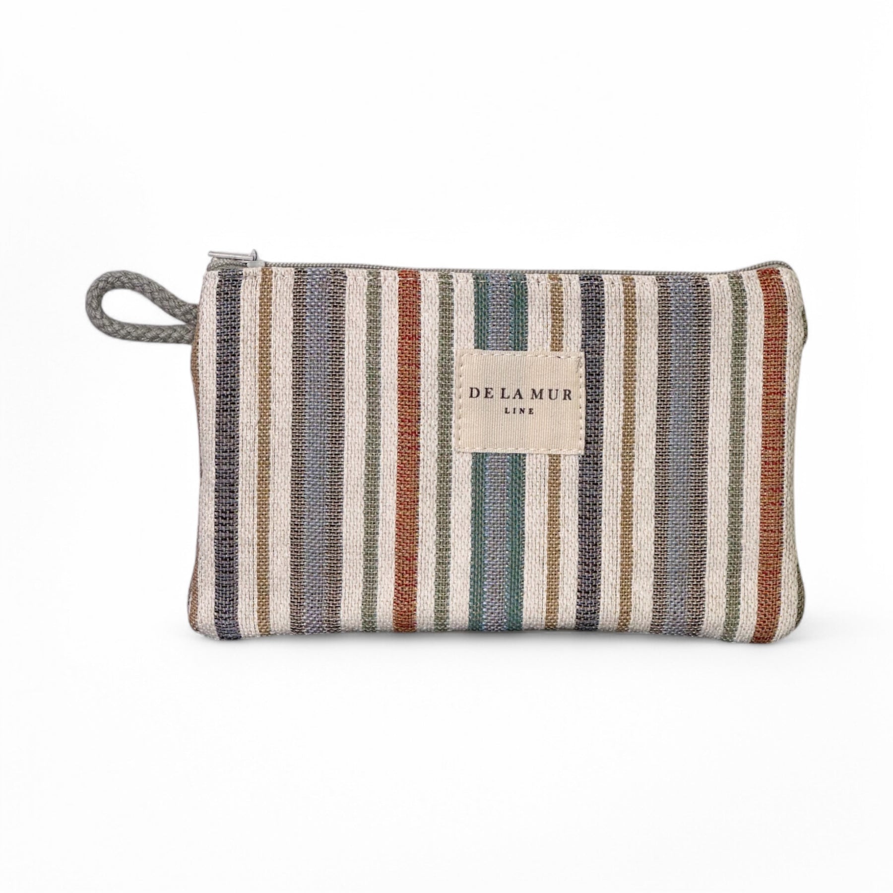 Mini neceser con cremallera en la parte superior y pequeña asa de cordón de color beige en el lateral. Con un tejido con estampado a rayas en tonos grises, ocres y azules. Cada articulo puede tener una variación en el estampado, dependiendo de donde se haya efectuado el corte de la pieza. Para su correcto mantenimiento se aconseja lavarlo en frío a mano y no utilizar secadora.