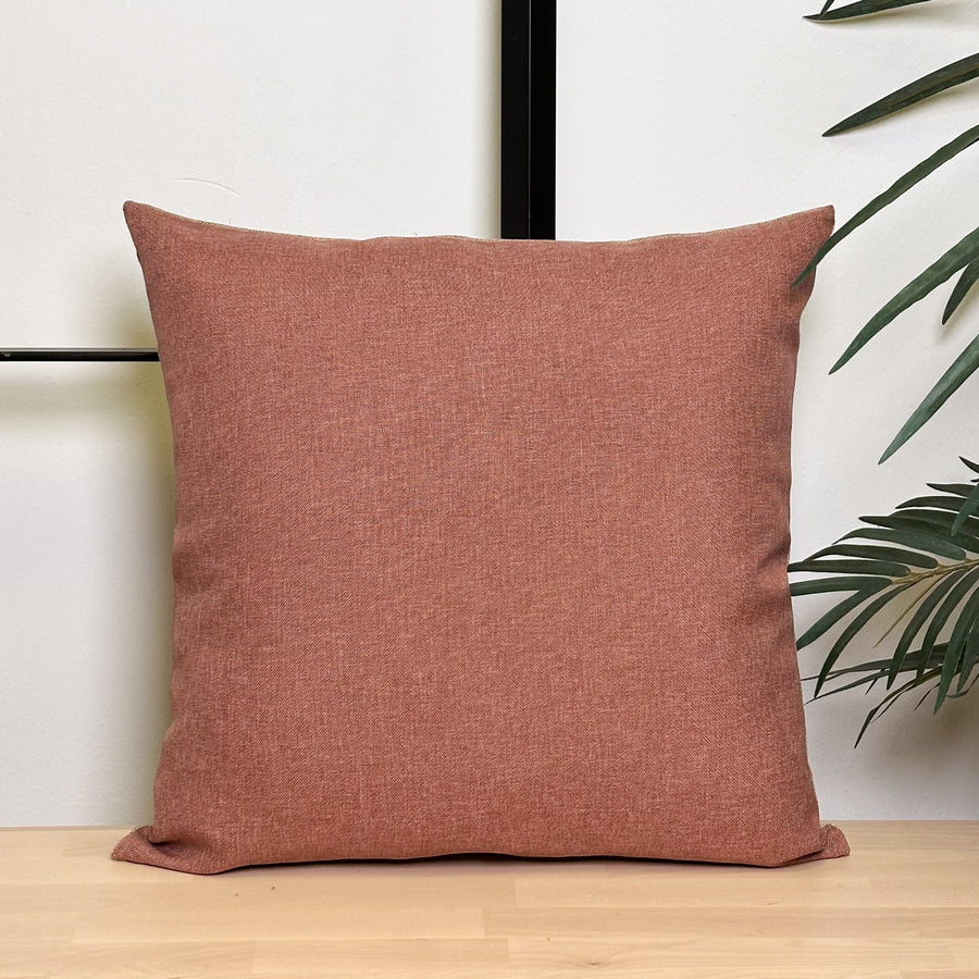 Funda de cojín sin relleno. Combinado con dos tejidos diferentes, un tejido liso de color granatoso por una cara, y un tejido liso de color yute por la otra. Para su correcto mantenimiento se aconseja lavarlo en frío y no utilizar secadora.