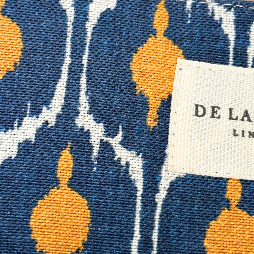 Funda de gafas con cremallera en la parte superior y pequeña asa de cordón de color beige en el lateral. Con tejido fino de half-panama con estampado geométrico en tono azul y mostaza. Cada articulo puede tener una variación en el estampado, dependiendo de donde se haya efectuado el corte de la pieza. Forrado de tejido grueso de color gris en la parte interior. Para su correcto mantenimiento se aconseja lavarlo en frío a mano y no utilizar secadora.