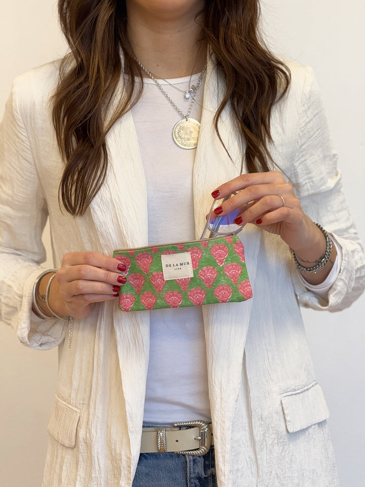 Funda de gafas con cremallera en la parte superior y pequeña asa de cordón de color beige en el lateral. Con tejido fino de half-panama con estampado floral en tonos verde y rosa. Cada articulo puede tener una variación en el estampado, dependiendo de donde se haya efectuado el corte de la pieza. Forrado de tejido grueso de color gris en la parte interior. Para su correcto mantenimiento se aconseja lavarlo en frío a mano y no utilizar secadora.