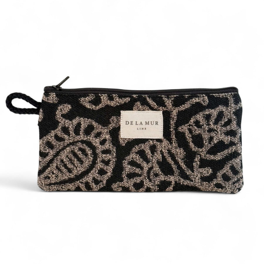 Funda de gafas con cremallera en la parte superior y pequeña asa de cordón de color negro en el lateral. Con tejido grueso de jacquard con estampado floral beige sobre fondo negro. Cada articulo puede tener una variación en el estampado, dependiendo de donde se haya efectuado el corte de la pieza. Forrado de tejido grueso de color gris en la parte interior. Para su correcto mantenimiento se aconseja lavarlo en frío a mano y no utilizar secadora.