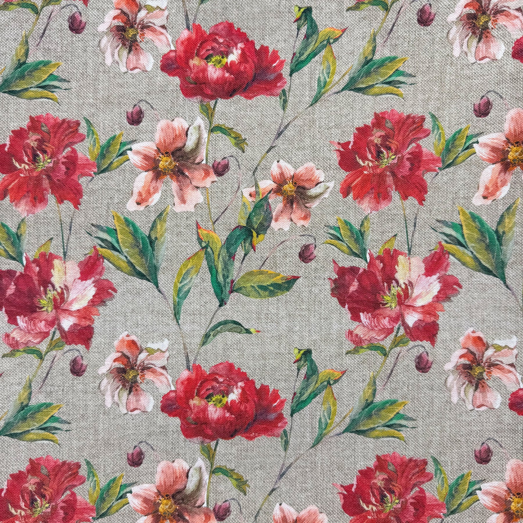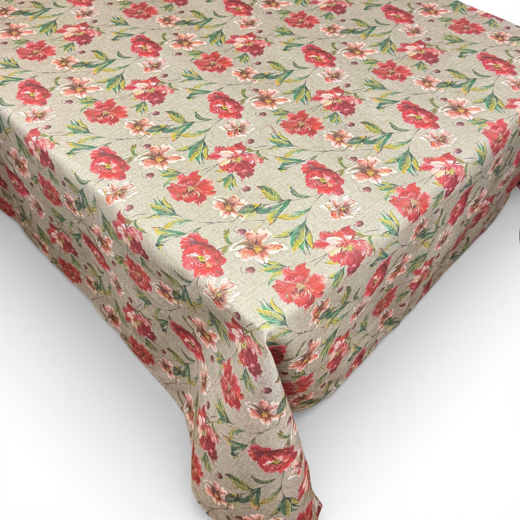 Mantel para mesa confeccionado en tejido fino de half-panama 80% algodón y 20% poliéster, con estampado floral rojo. Una pieza con textura y presencia que viste la mesa con elegancia natural y un estilo atemporal.