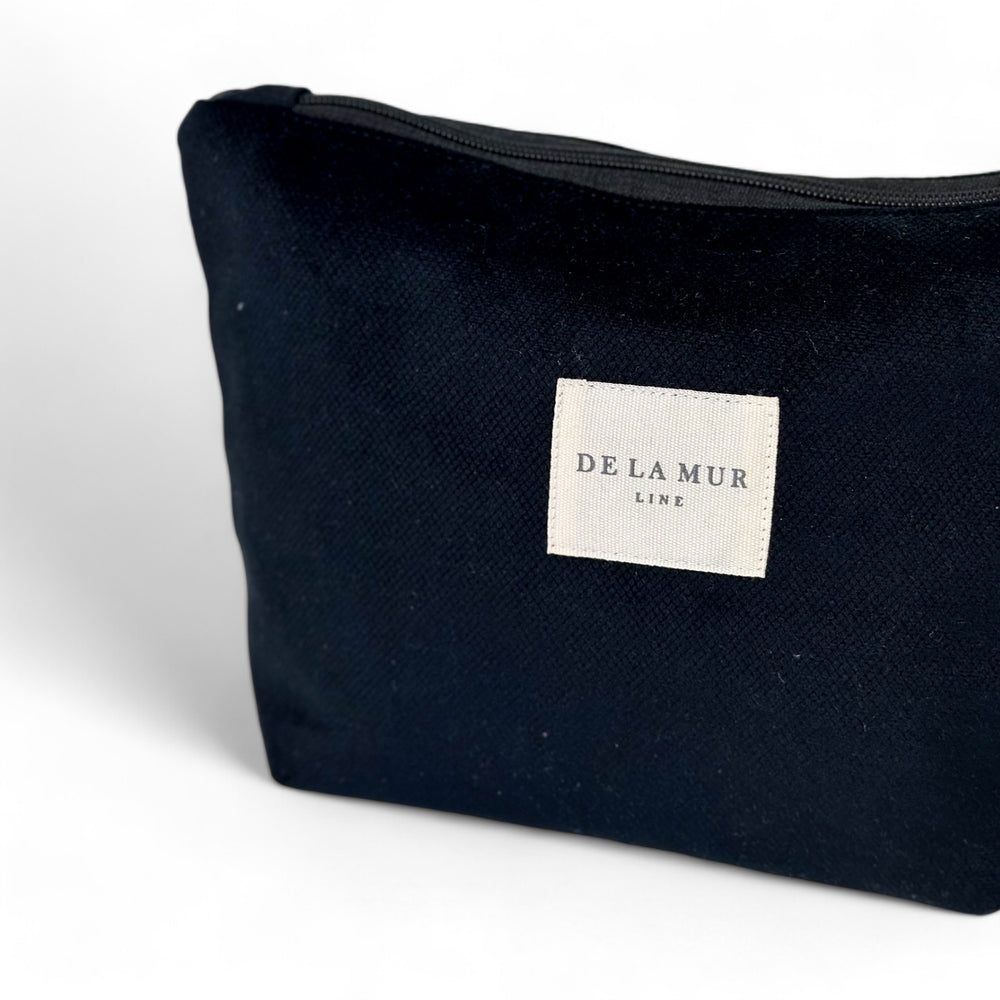 Neceser con cremallera en la parte superior y asa de cordón de color negro en el lateral. Con tejido grueso de terciopelo negro. Forrado de tejido grueso de color gris en la parte interior. Para su correcto mantenimiento se aconseja lavarlo en frío a mano y no utilizar secadora.