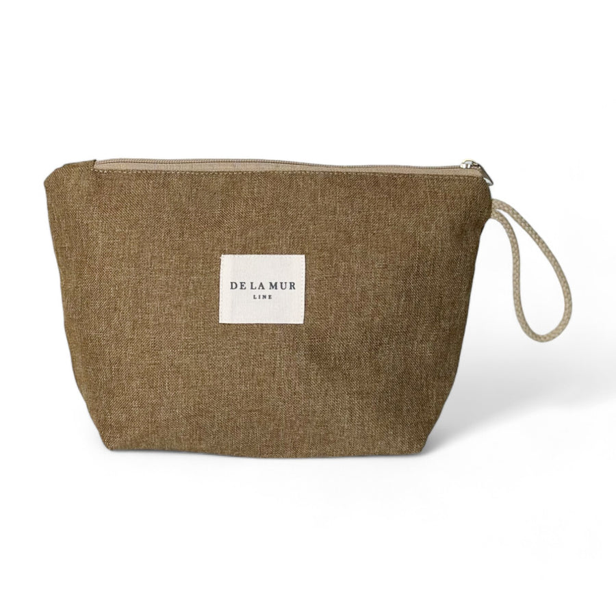 Neceser con cremallera en la parte superior y asa de cordón de color beige en el lateral. Con tejido grueso liso de color ocre. Forrado de tejido grueso de color gris en la parte interior. Para su correcto mantenimiento se aconseja lavarlo en frío a mano y no utilizar secadora.