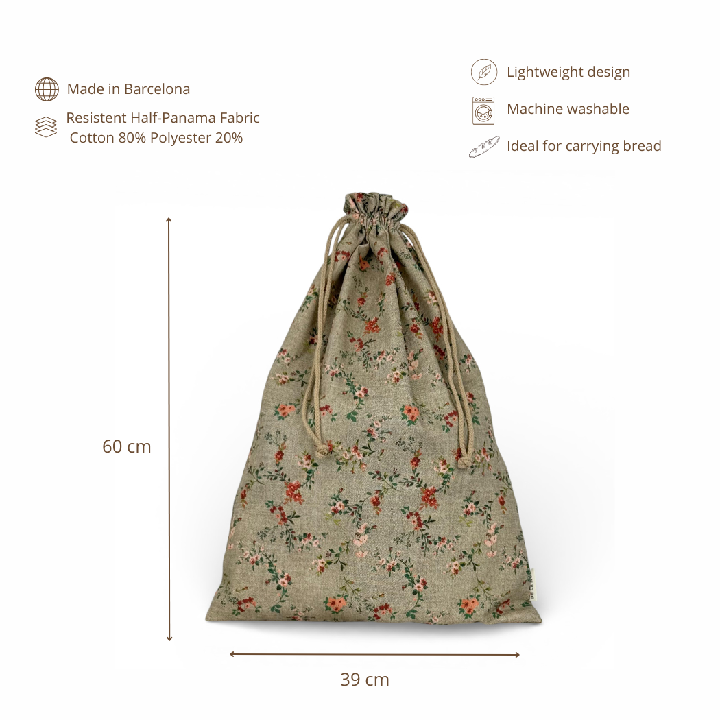 Bolsa para el pan confeccionada en tejido de half-panama 80% algodón y 20% poliéster con estampado floral naranja. Un diseño sencillo y bonito que aporta un toque especial a la cocina y muy útil para ir a comprar.