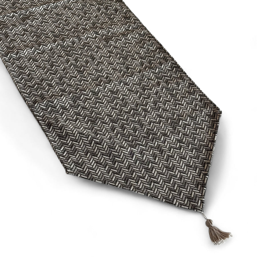 Camino de mesa acabado en forma de pico con borla en los extremos de color beige. Con tejido grueso de jacquard con estampado geométrico en tonos beige y marrón. Para su correcto mantenimiento se aconseja lavarlo en frío y no utilizar secadora.