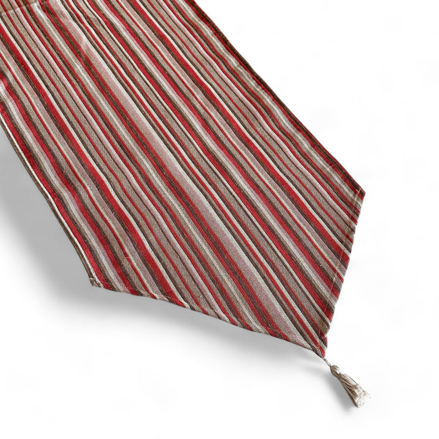 Camino de mesa acabado en forma de pico con borla en los extremos de color beige. Con tejido grueso de jacquard con estampado a rayas en tonos marrón y granate. Para su correcto mantenimiento se aconseja lavarlo en frío y no utilizar secadora.