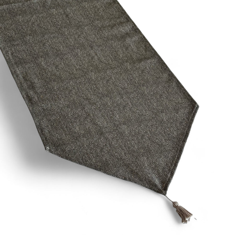 Camino de mesa acabado en forma de pico con borla en los extremos de color beige. Con tejido fino con estampado tipo saco de color caqui. Para su correcto mantenimiento se aconseja lavarlo en frío y no utilizar secadora.