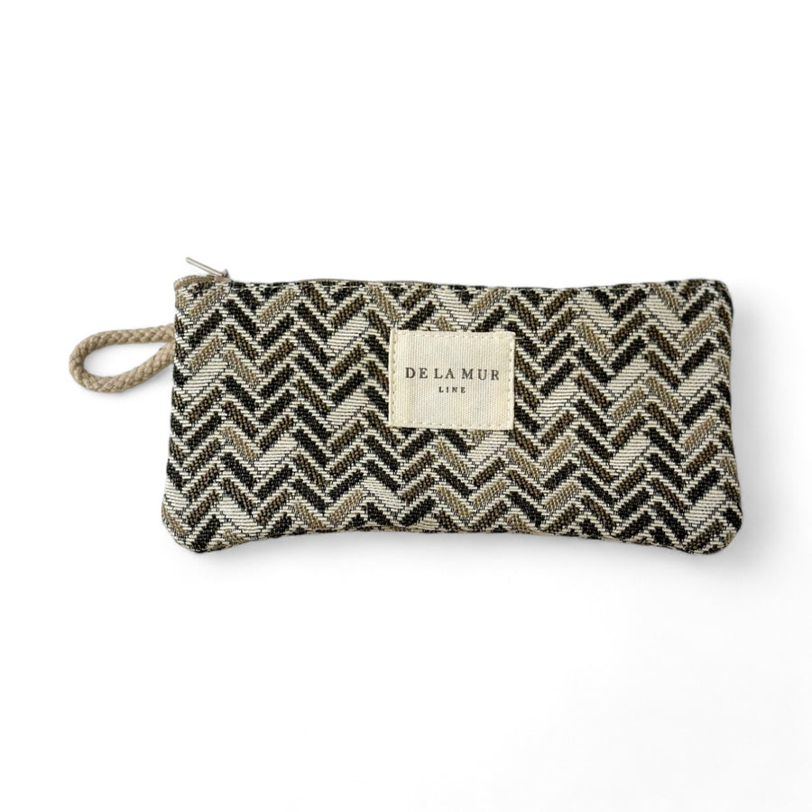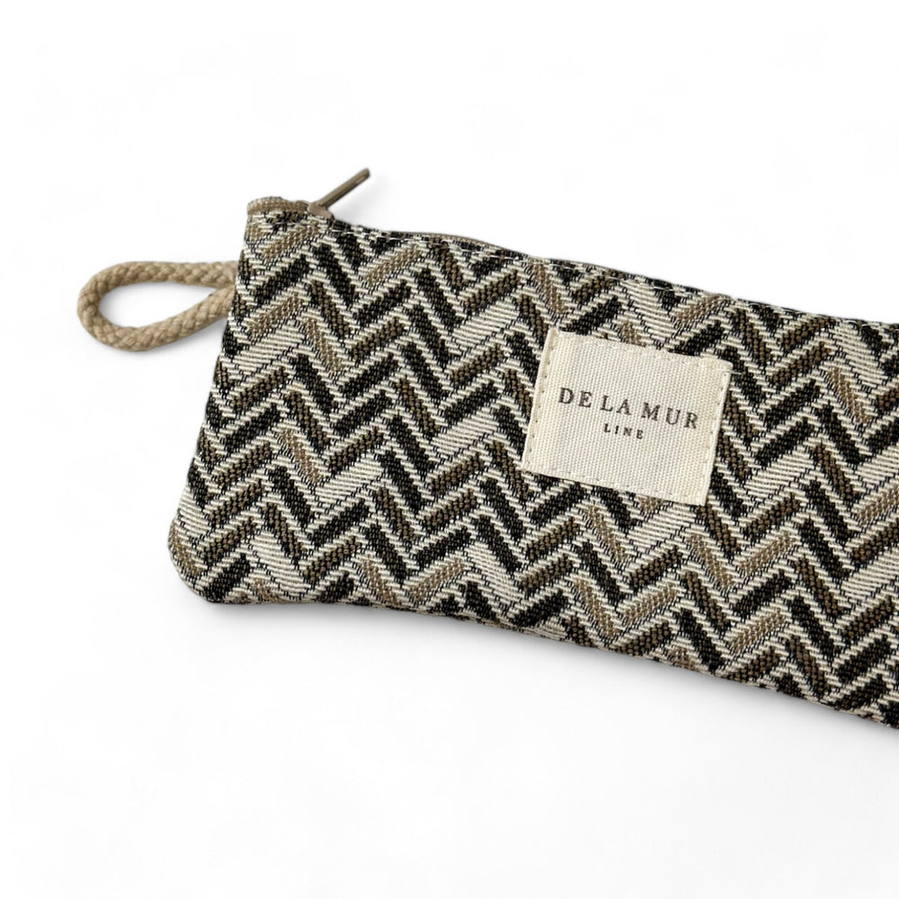 Funda de gafas con cremallera en la parte superior y pequeña asa de cordón de color beige en el lateral. Con tejido grueso de jacquard con estampado geométrico en tonos marrones. Cada articulo puede tener una variación en el estampado, dependiendo de donde se haya efectuado el corte de la pieza. Forrado de tejido grueso de color gris en la parte interior. Para su correcto mantenimiento se aconseja lavarlo en frío a mano y no utilizar secadora.
