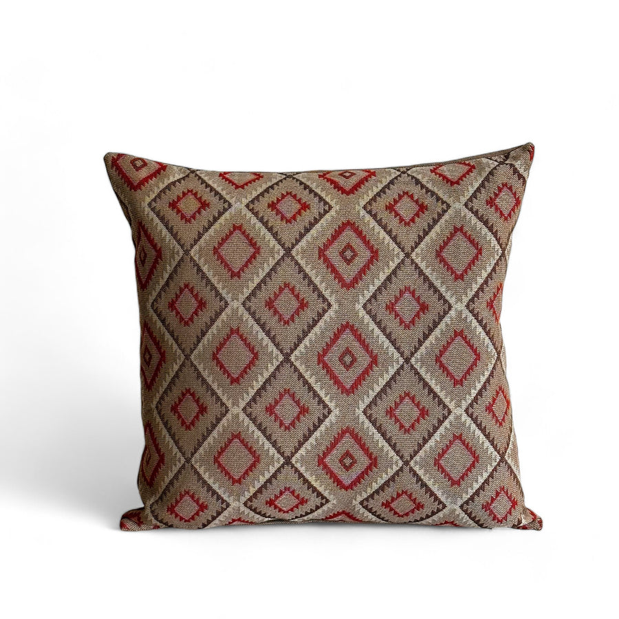 Funda de cojín sin relleno. Combinado con dos tejidos diferentes, un tejido grueso de jacquard con estampado geométrico en tonos marrón y granate por una cara, y un tejido liso tipo saco de color tierra por la otra. Para su correcto mantenimiento se aconseja lavarlo en frío y no utilizar secadora.