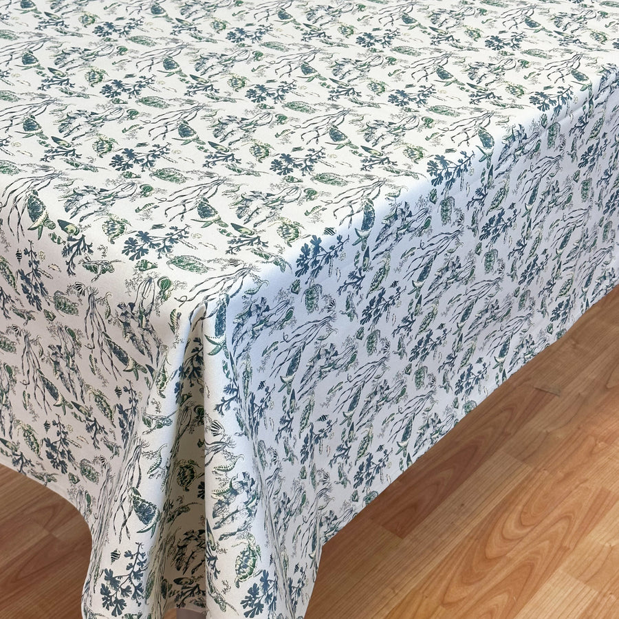Mantel para mesa. Con tejido con estampado de peces en tonos azules. Para su correcto mantenimiento se aconseja lavarlo en frío y no utilizar secadora.