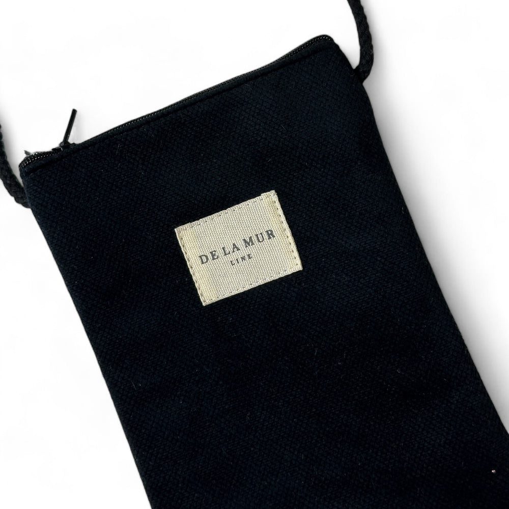Bolsito porta móvil para llevar tipo bandolera, con cremallera en la parte superior y cordón largo de algodón de color negro. Con tejido grueso de terciopelo negro. Cada articulo puede tener una variación en el estampado, dependiendo de donde se haya efectuado el corte de la pieza. Forrado de tejido grueso de color gris en la parte interior. Para su correcto mantenimiento se aconseja lavarlo en frío a mano y no utilizar secadora.