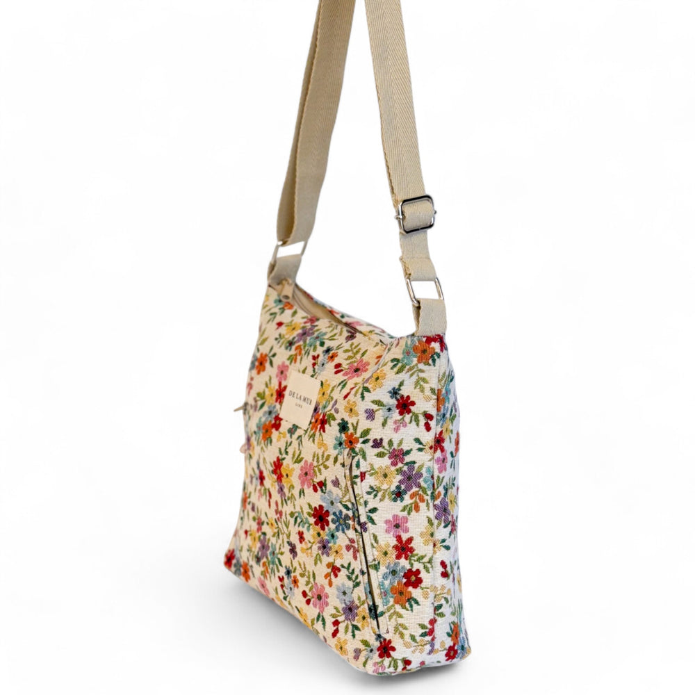 Bolso mediano tipo bandolera con asa larga ajustable de cinta de espiga de algodón de color beige. Con un tejido grueso de jacquard con estampado floral sobre fondo beige. Cierre superior con cremallera. Dos bolsillos en la parte frontal con cremallera. Forrado de tejido grueso de color gris en la parte interior. Bolsillo interior con cremallera. Para su correcto mantenimiento se aconseja lavarlo en frío a mano y no utilizar secadora.