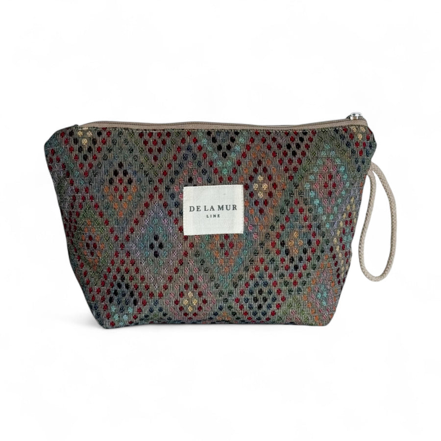 Neceser con cremallera en la parte superior y asa de cordón de color beige en el lateral. Con tejido grueso de jacquard con estampado geométrico multicolor sobre fondo gris. Forrado de tejido grueso de color gris en la parte interior. Para su correcto mantenimiento se aconseja lavarlo en frío a mano y no utilizar secadora.