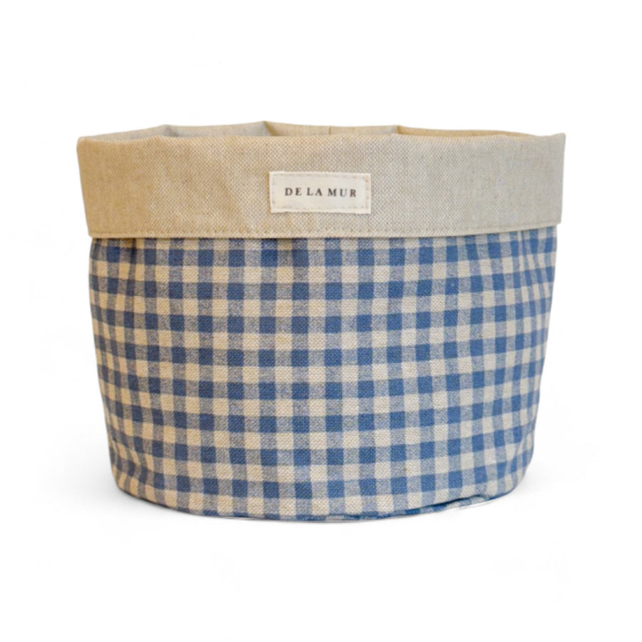 Cesta mediana multiusos. Con tejido fino de half-panama con estampado a cuadros vichy azules en el exterior, y tejido resinado en el interior. Para su correcto mantenimiento se aconseja lavarlo en frío y no utilizar la secadora.