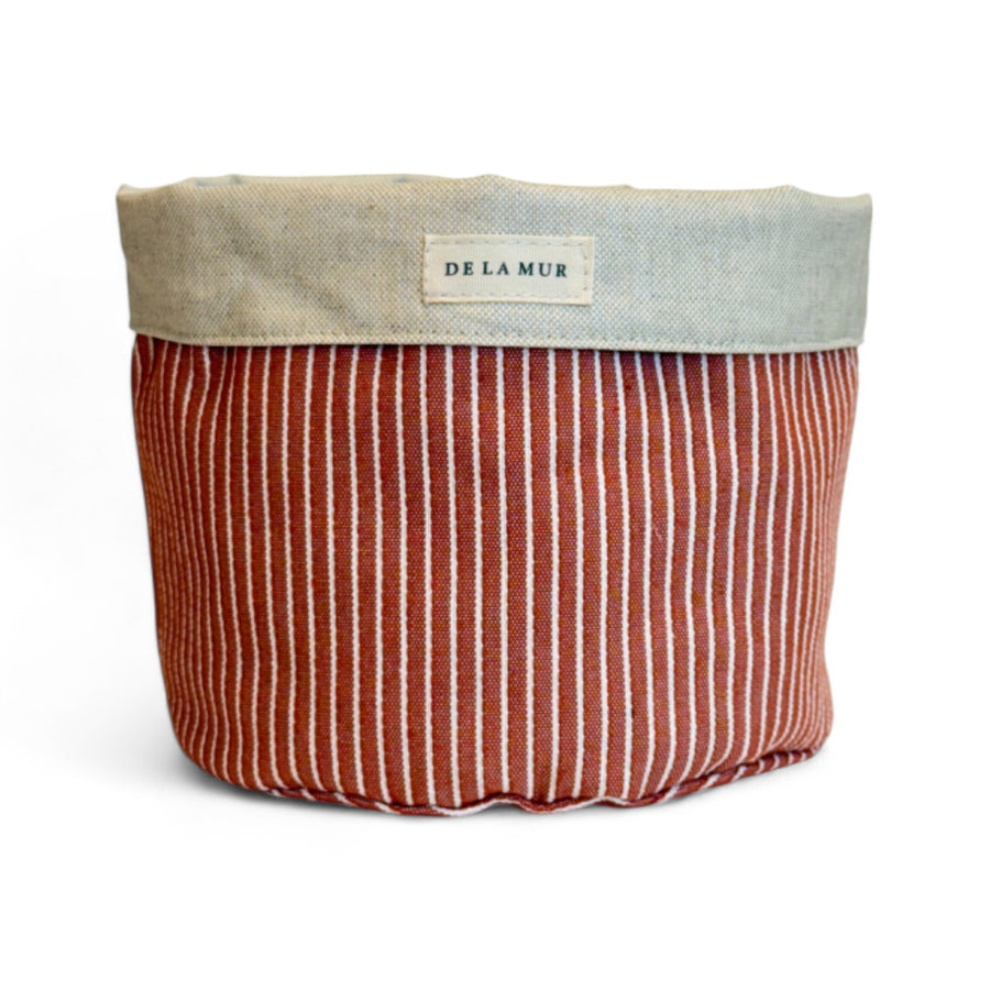 Cesta mediana multiusos. Con tejido fino con textura con estampado a rayas de color crudo sobre fondo teja en el exterior, y tejido resinado en el interior. Para su correcto mantenimiento se aconseja lavarlo en frío y no utilizar la secadora.