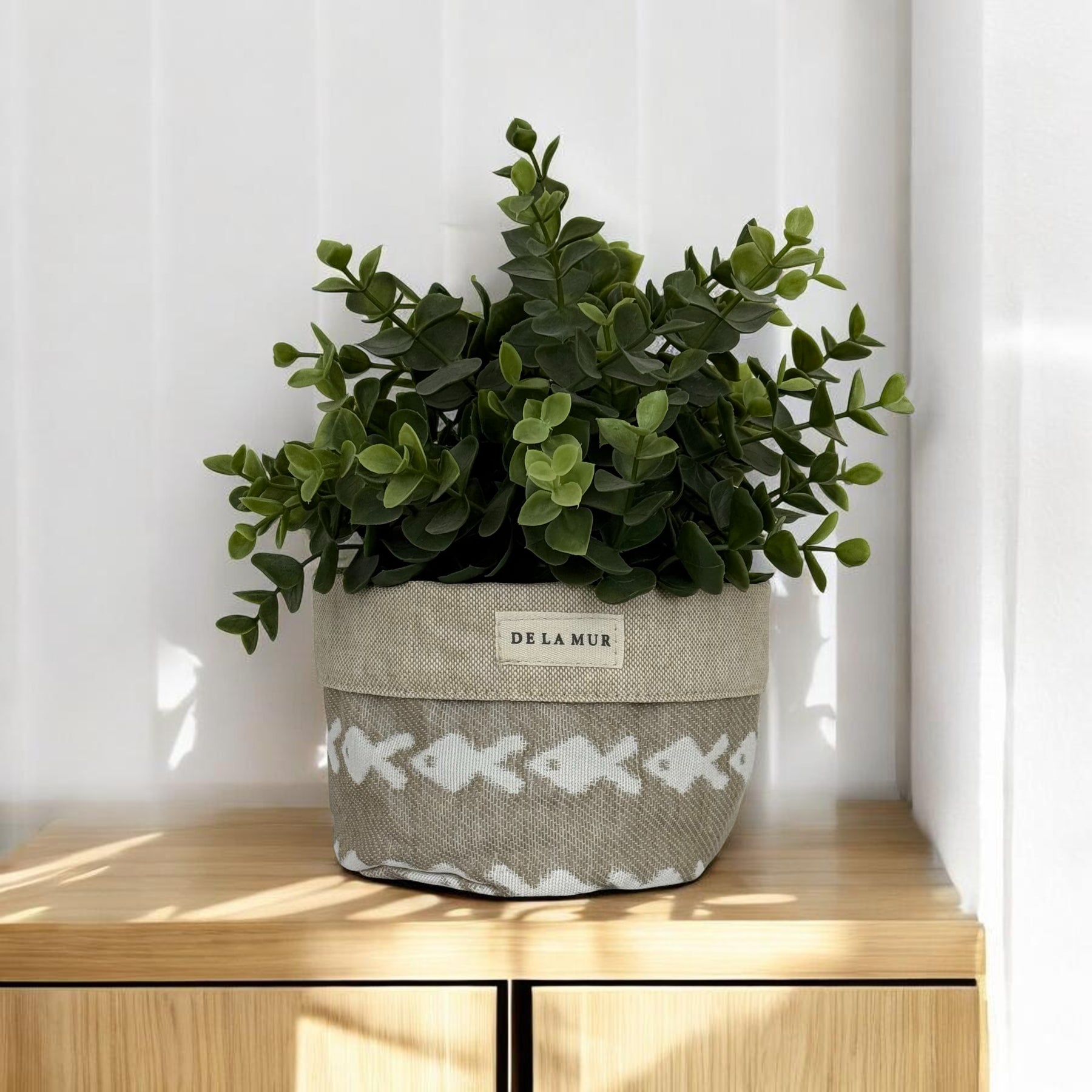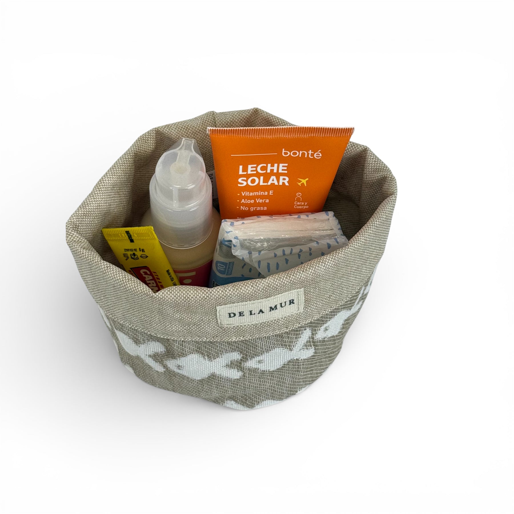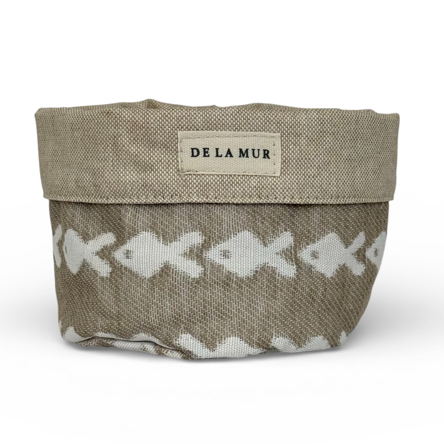 Cesta pequeña multiusos confeccionada en tejido jacquard grueso 80% algodón y 20% poliéster, con estampado de peces en tonos beige y crudo en el exterior. El interior está realizado en tejido beige resinado, ideal para aportar mayor resistencia y practicidad en el uso diario.