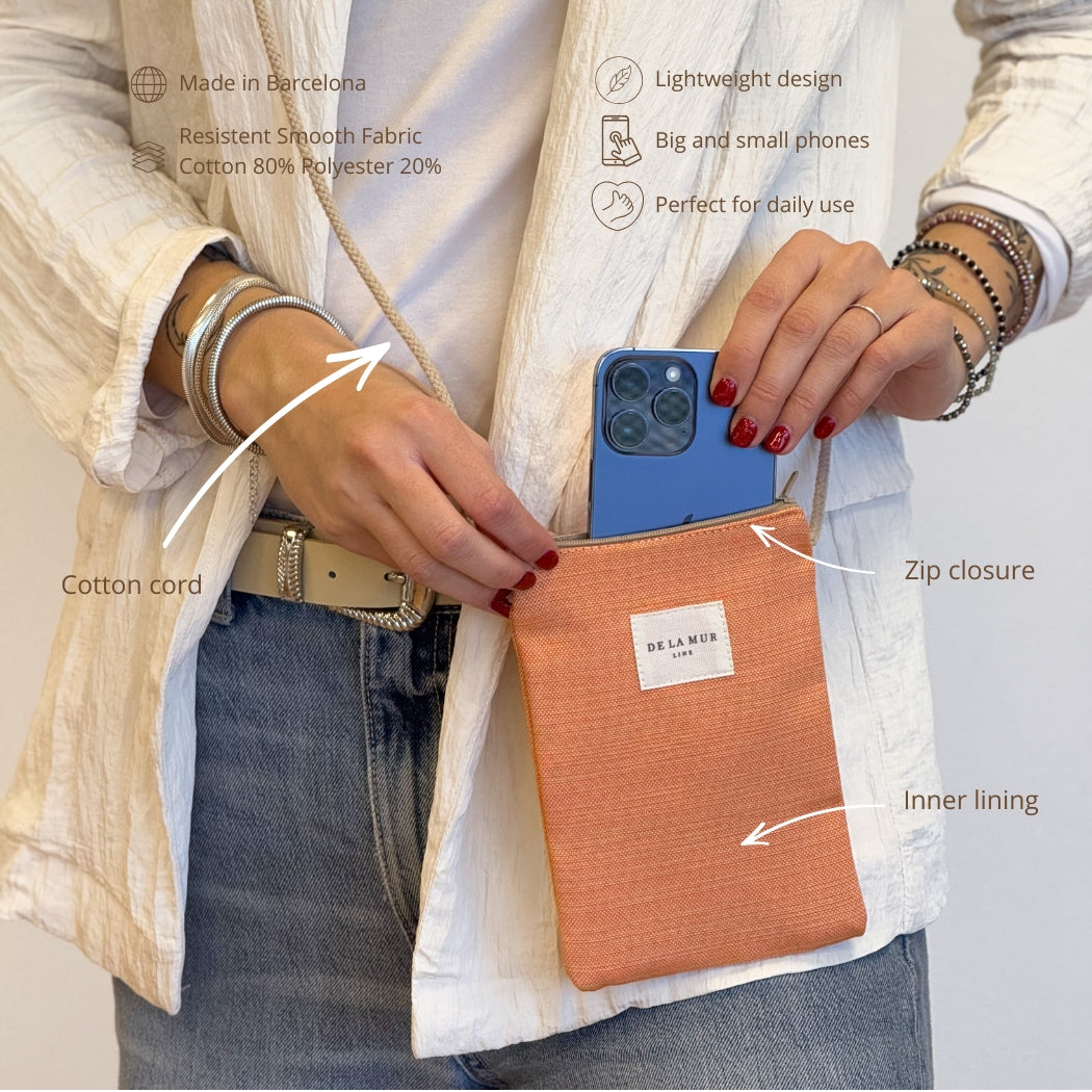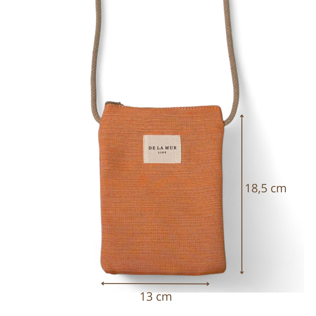 Bolsito porta móvil para llevar tipo bandolera. Con cremallera en la parte superior y cordón largo de algodón de color beige. Con tejido fino de color naranja. Cada articulo puede tener una variación en el estampado, dependiendo de donde se haya efectuado el corte de la pieza. Forrado de tejido grueso de color gris en la parte interior. Para su correcto mantenimiento se aconseja lavarlo en frío a mano y no utilizar secadora.
