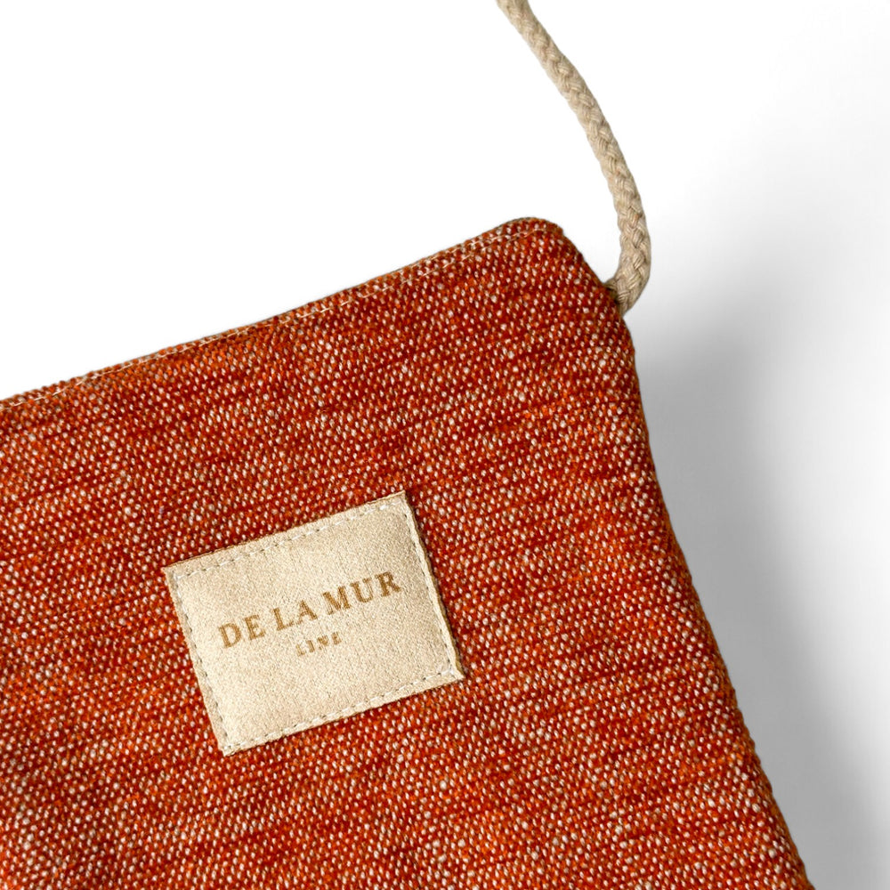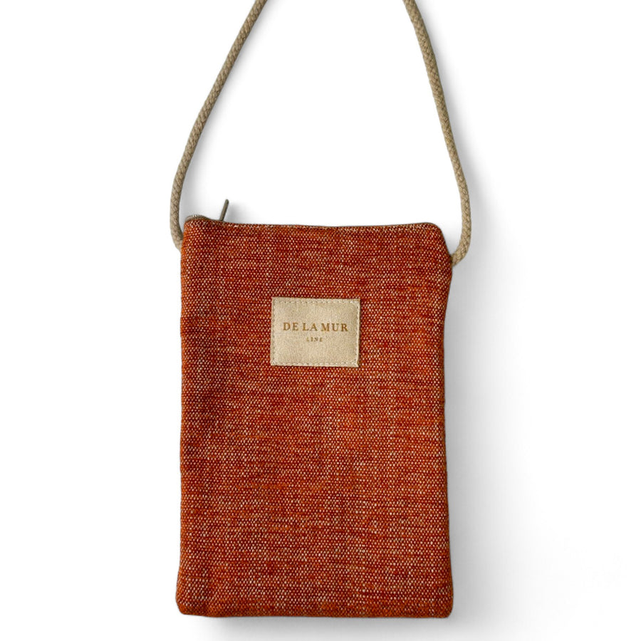 Bolsito porta móvil para llevar tipo bandolera, con cremallera en la parte superior y cordón largo de algodón de color beige. Con un tejido liso efecto desgastado de color teja. Forrado de tejido grueso de color gris en la parte interior. Etiqueta de marca de polipiel. Para su correcto mantenimiento se aconseja lavarlo en frío a mano y no utilizar secadora.