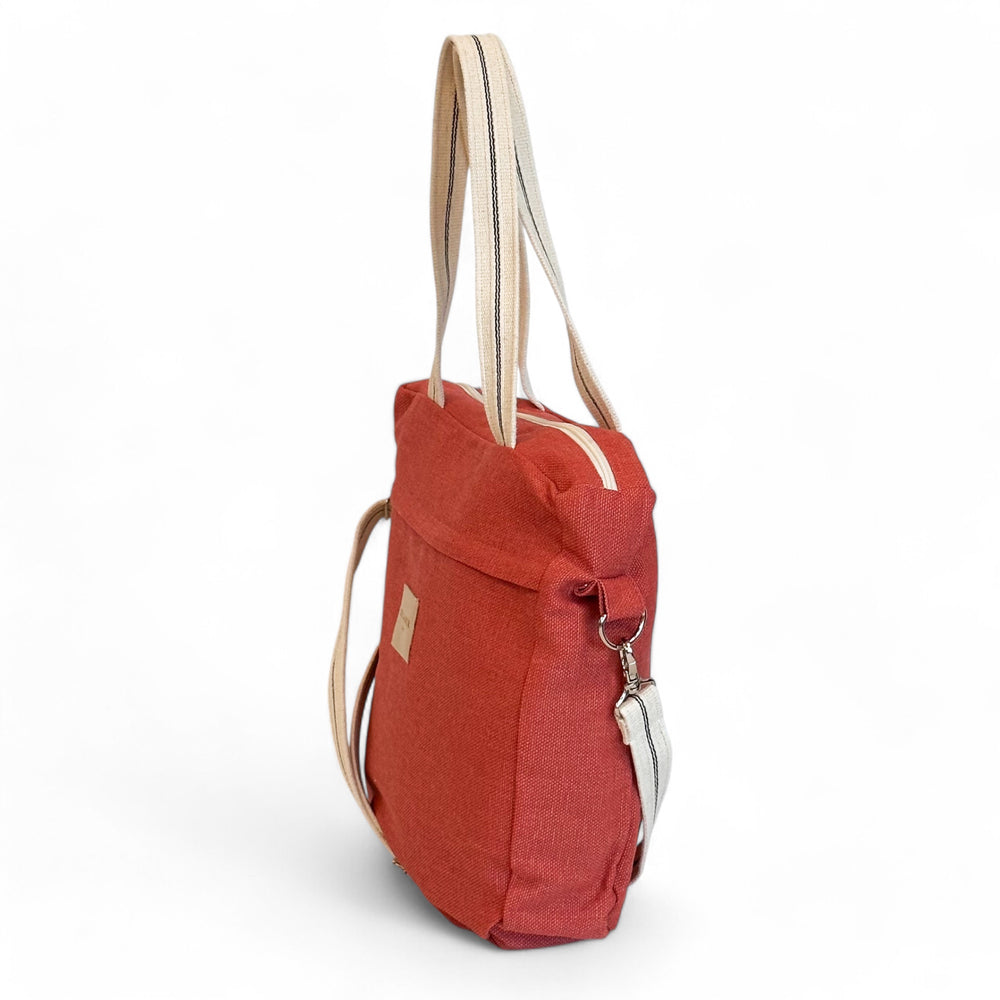 Bolso grande con asa larga ajustable y dos asas medianas en la parte superior. Con un tejido liso de color teja. Opción de llevarlo al hombro o como bandolera. Bolsillo interior con cremallera y bolsillo exterior grande con cremallera. Asas de cinta de espiga de algodón de color crudo con raya de color gris en la parte central. Etiqueta de marca de polipiel. Para su correcto mantenimiento se aconseja lavarlo en frío y no utilizar secadora.
