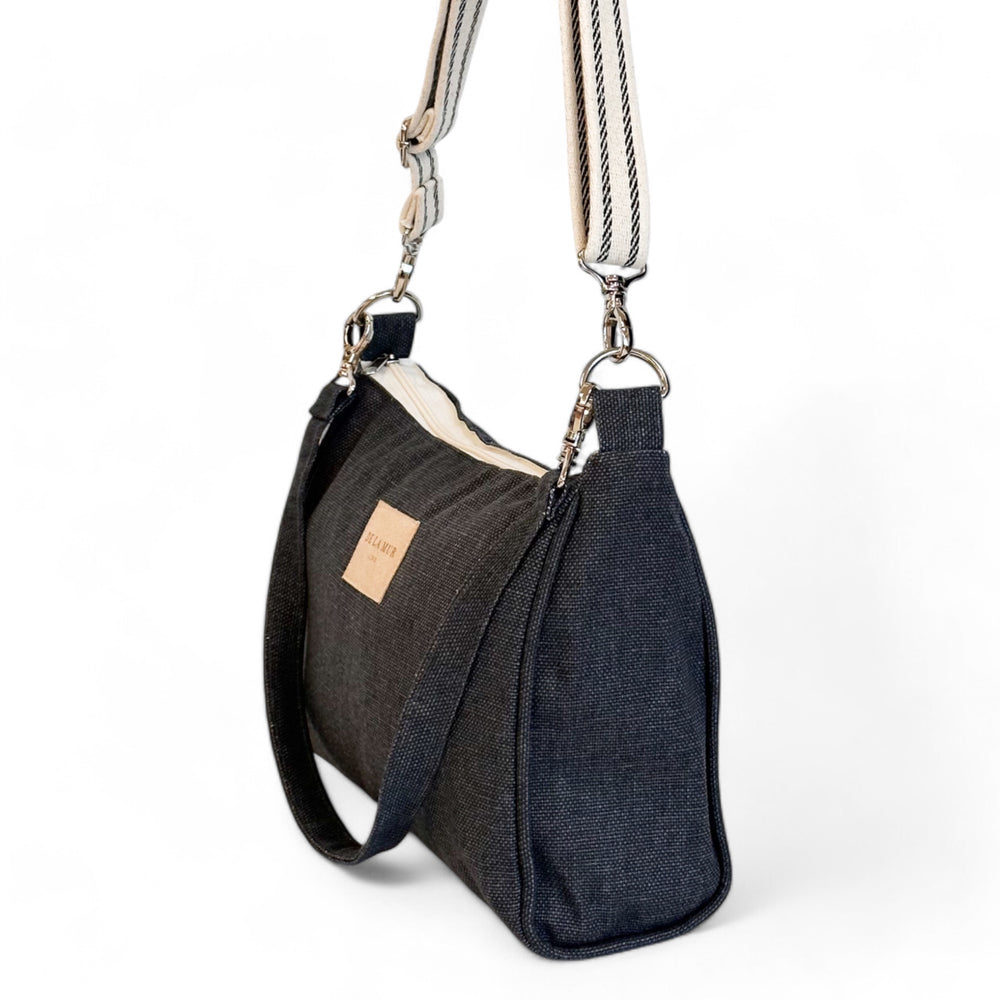 Bolso mediano con asa larga ajustable y un asa corta de tejido. Con un tejido liso de color gris oscuro. Opción de llevarlo al hombro o como bandolera. Bolsillo interior con cremallera. Asa de cinta de espiga de algodón de color crudo con dos rayas de color gris oscuro en el centro. Etiqueta de marca de polipiel. Para su correcto mantenimiento se aconseja lavarlo en frío a mano y no utilizar secadora.
