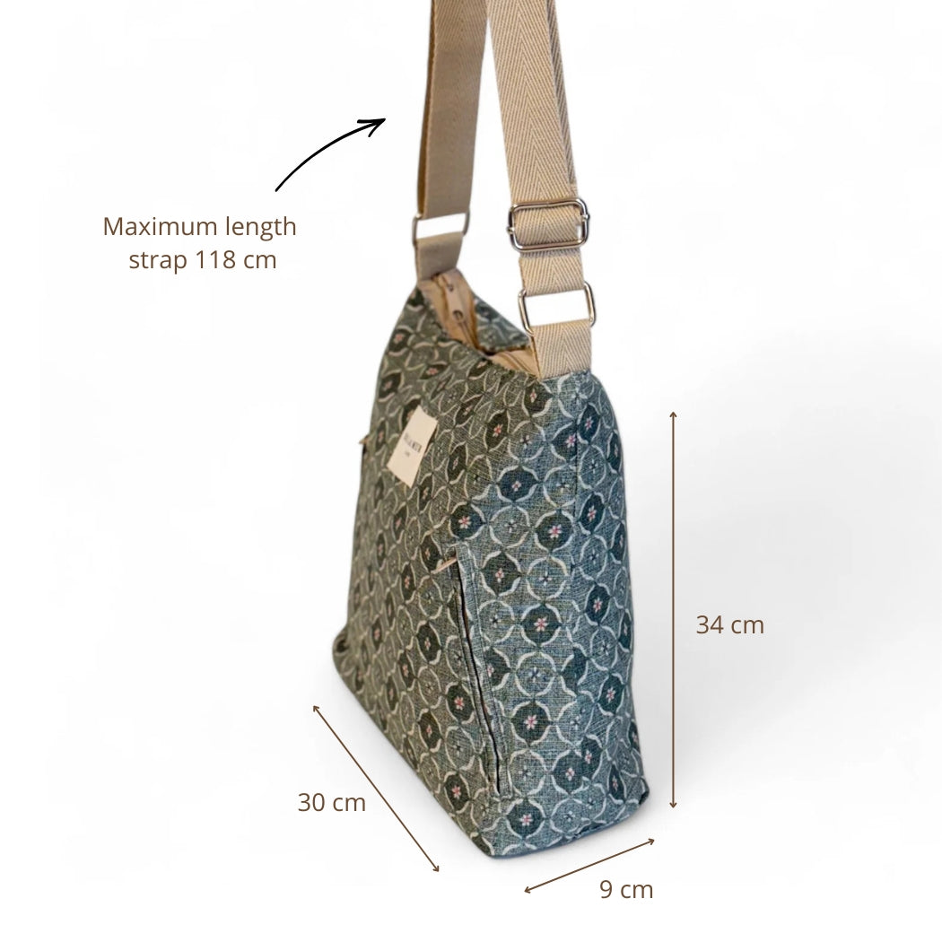 Bolso mediano tipo bandolera con asa larga ajustable de cinta de espiga de algodón de color beige. Con un tejido fino de half-panama con estampado geométrico en tonos verdes. Cierre superior con cremallera. Dos bolsillos en la parte frontal con cremallera. Forrado de tejido grueso de color gris en la parte interior. Bolsillo interior con cremallera. Para su correcto mantenimiento se aconseja lavarlo en frío a mano y no utilizar secadora.
