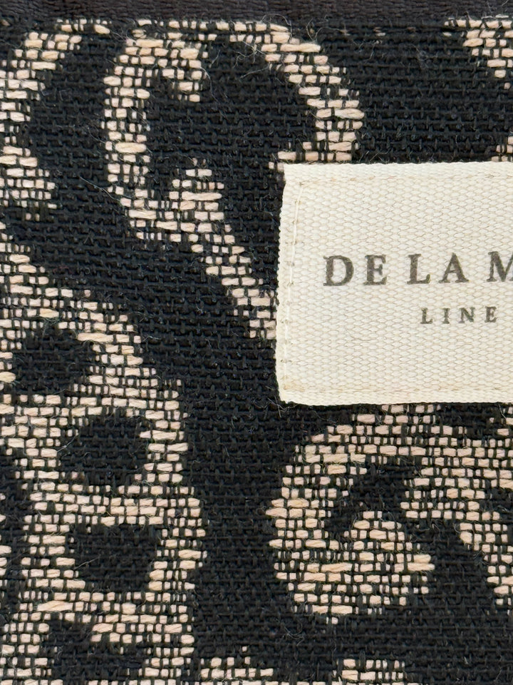 Mini neceser con cremallera en la parte superior y pequeña asa de cordón de color negro en el lateral. Con tejido grueso de jacquard con estampado floral de color beige sobre fondo negro. Cada articulo puede tener una variación en el estampado, dependiendo de donde se haya efectuado el corte de la pieza. Forrado de tejido grueso de color gris en la parte interior. Para su correcto mantenimiento se aconseja lavarlo en frío a mano y no utilizar secadora.