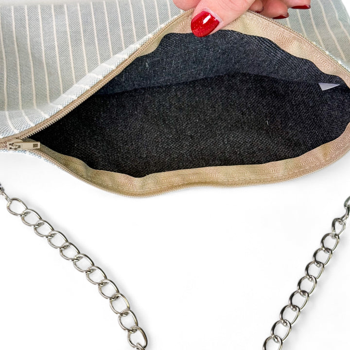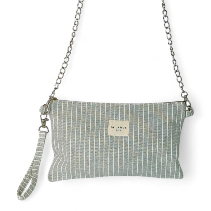 Bolso tipo "Clutch" con asa de cadena de color plata y con asa pequeña en el lateral extraíble para llevar en la muñeca. Con tejido fino de rayas verde agua. Con forro interior y cremallera en la parte superior. Para su correcto mantenimiento se aconseja lavarlo en frío y no utilizar secadora.