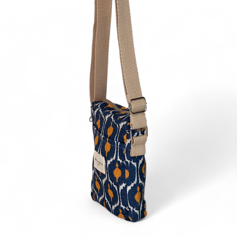 Bolso porta móvil para llevar tipo bandolera, con cremallera en la parte superior y asa larga ajustable de cinta de espiga de algodón de color beige. Bolsillo sin cremallera en la parte exterior. Con tejido fino de half-panama con estampado geométrico de color azul y mostaza. Forrado de tejido grueso de color gris en la parte interior. Para su correcto mantenimiento se aconseja lavarlo en frío a mano y no utilizar secadora.