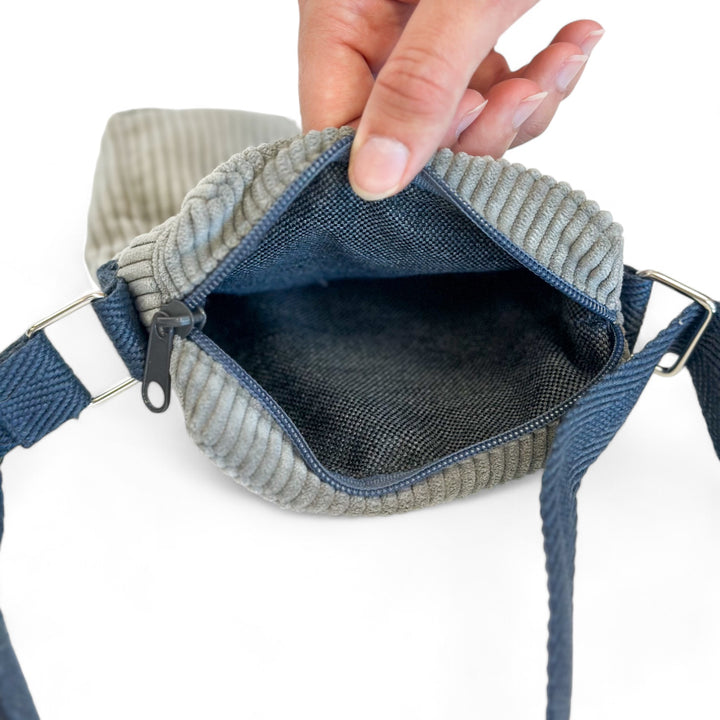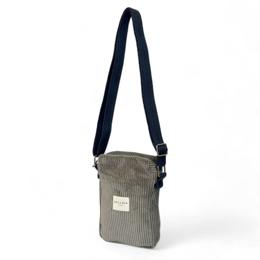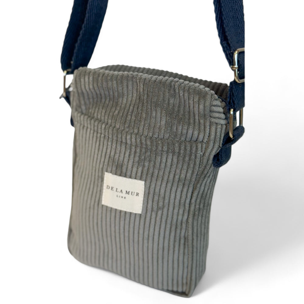 Bolso porta móvil para llevar tipo bandolera, con cremallera en la parte superior y asa larga ajustable de cinta de espiga de algodón de color gris oscuro. Bolsillo sin cremallera en la parte exterior. Con tejido grueso de pana gris. Forrado de tejido grueso de color gris en la parte interior. Para su correcto mantenimiento se aconseja lavarlo en frío a mano y no utilizar secadora.