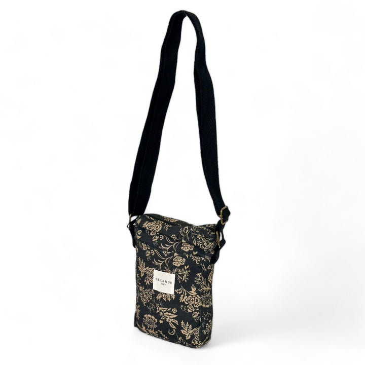 Bolso porta móvil para llevar tipo bandolera, con cremallera en la parte superior y asa larga ajustable de cinta de espiga de algodón de color negro. Bolsillo sin cremallera en la parte exterior. Con tejido fino con estampado floral en tonos negro y beige. Forrado de tejido grueso de color gris en la parte interior. Para su correcto mantenimiento se aconseja lavarlo en frío a mano y no utilizar secadora.