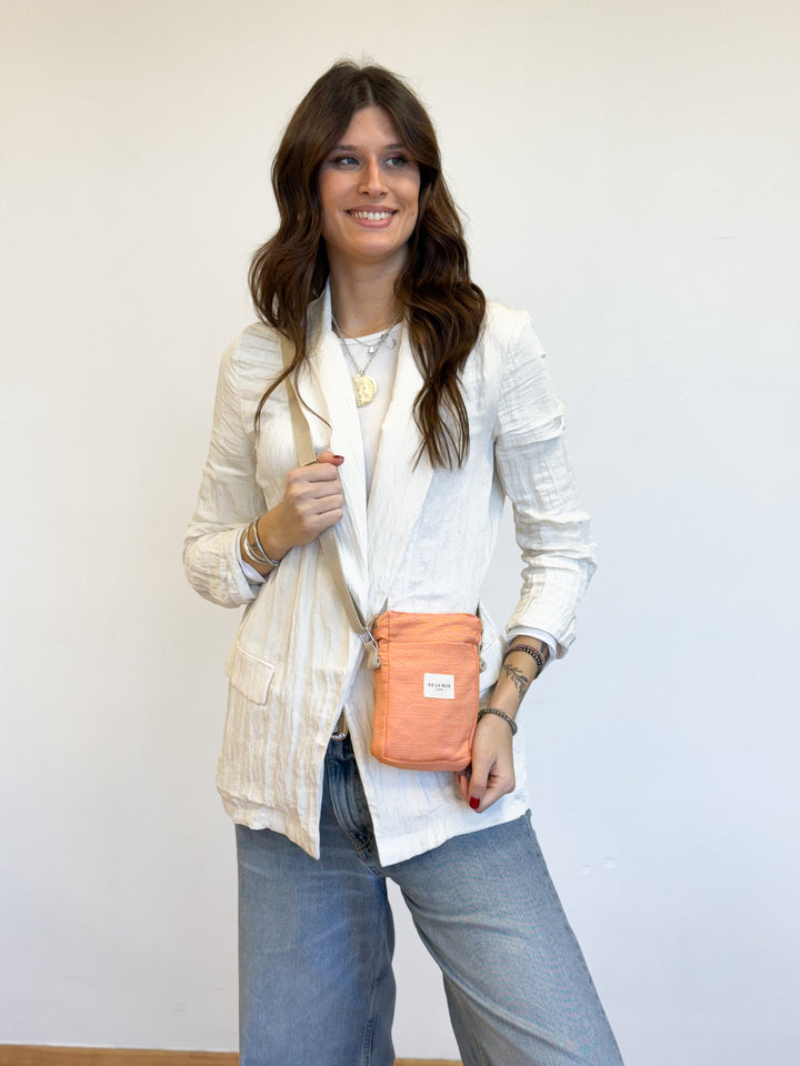Bolso porta móvil para llevar tipo bandolera, con cremallera en la parte superior y asa larga ajustable de cinta de espiga de algodón de color beige. Bolsillo sin cremallera en la parte exterior. Con tejido fino de color naranja. Forrado de tejido grueso de color gris en la parte interior. Para su correcto mantenimiento se aconseja lavarlo en frío a mano y no utilizar secadora.