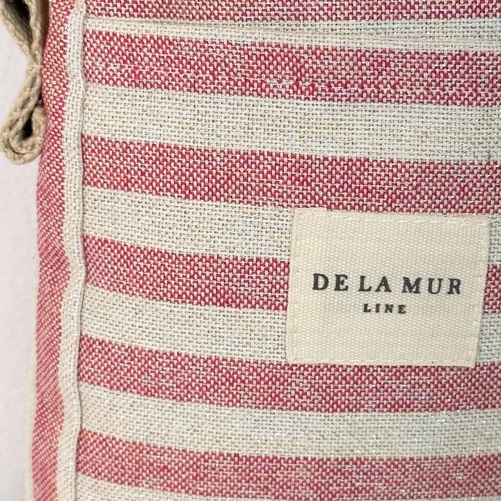 Bolso porta móvil para llevar tipo bandolera, con cremallera en la parte superior y asa larga ajustable de cinta de espiga de algodón de color beige. Bolsillo sin cremallera en la parte exterior. Con tejido fino de half-panama con estampado a rayas de color rosa y crudo con lurx brillante dorado y plateadao. Forrado de tejido grueso de color gris en la parte interior. Para su correcto mantenimiento se aconseja lavarlo en frío a mano y no utilizar secadora.