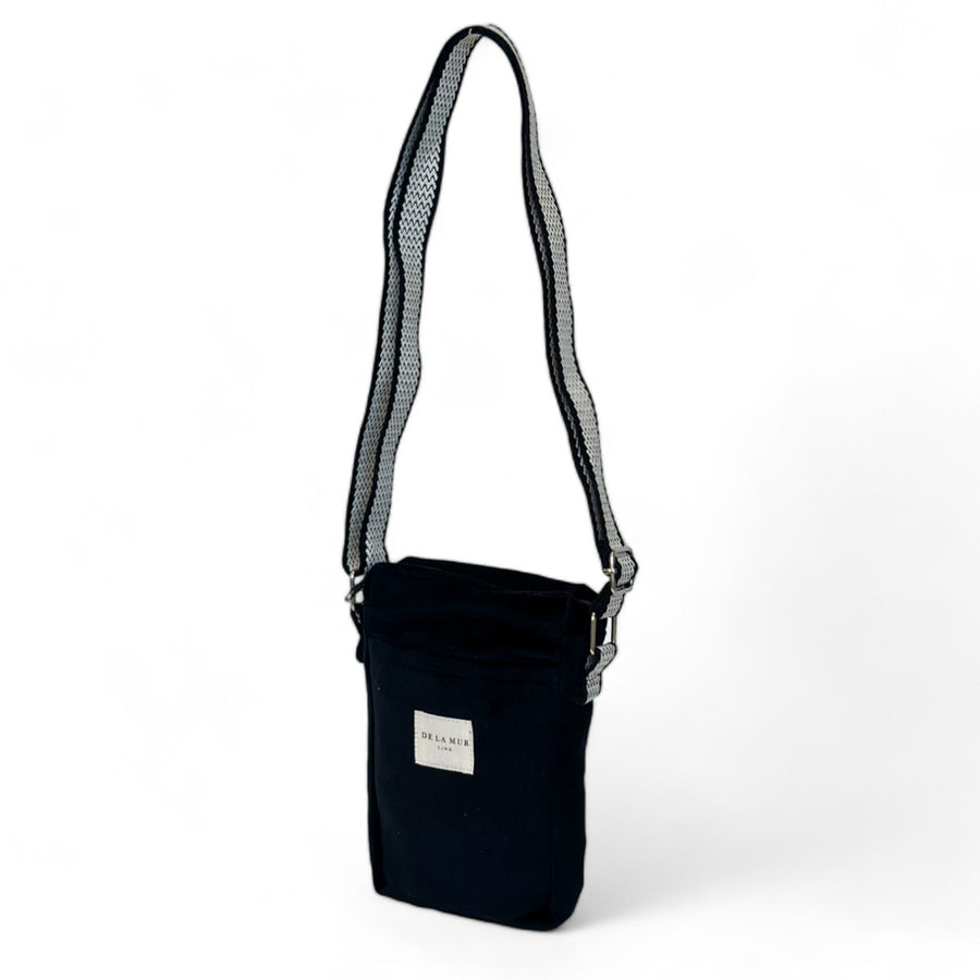 Bolso porta móvil para llevar tipo bandolera, con cremallera en la parte superior y asa larga ajustable de cinta de espiga de algodón con estampado tipo zigzag de color blanco y negro. Bolsillo sin cremallera en la parte exterior. Con tejido grueso de terciopelo negro. Forrado de tejido grueso de color gris en la parte interior. Para su correcto mantenimiento se aconseja lavarlo en frío a mano y no utilizar secadora.