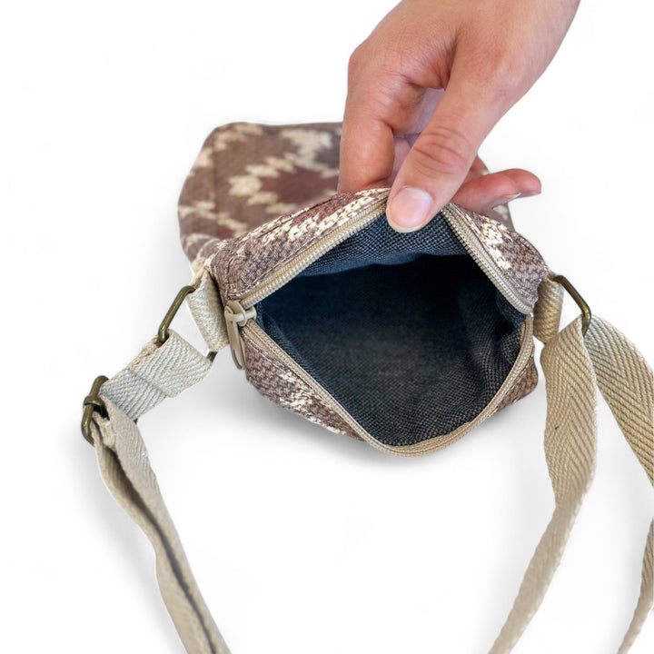 Bolso porta móvil para llevar tipo bandolera, con cremallera en la parte superior y asa larga ajustable de cinta de espiga de algodón de color beige. Bolsillo sin cremallera en la parte exterior. Con tejido fino con estampado geométrico en tonos granate, marrón y beige. Forrado de tejido grueso de color gris en la parte interior. Para su correcto mantenimiento se aconseja lavarlo en frío a mano y no utilizar secadora.