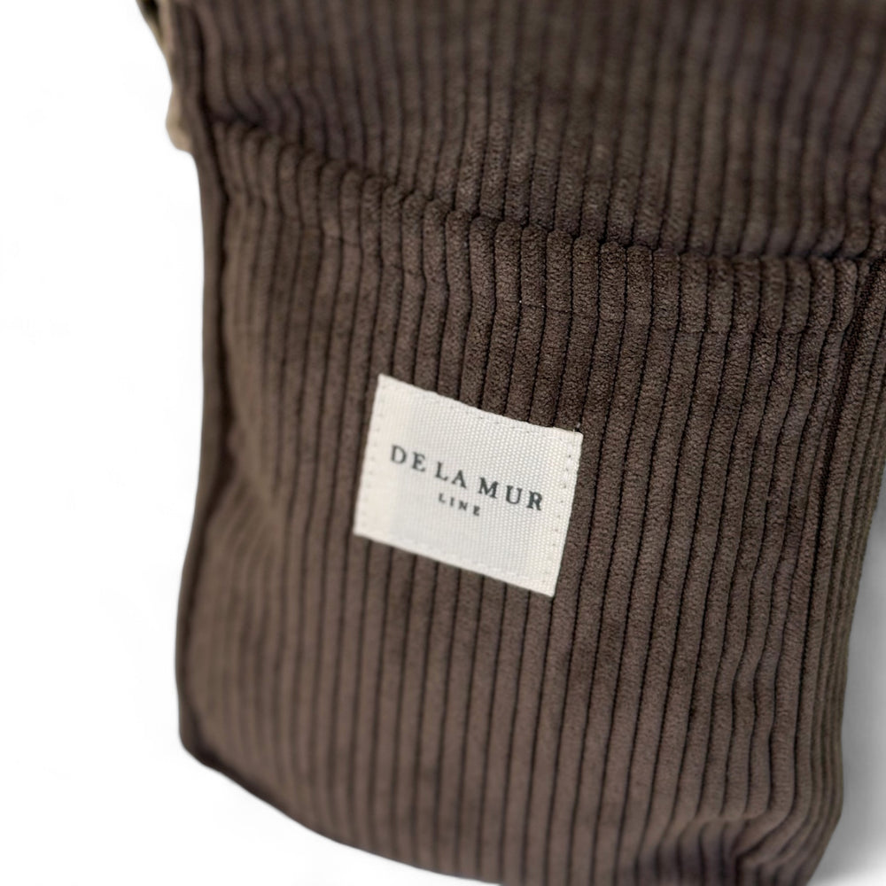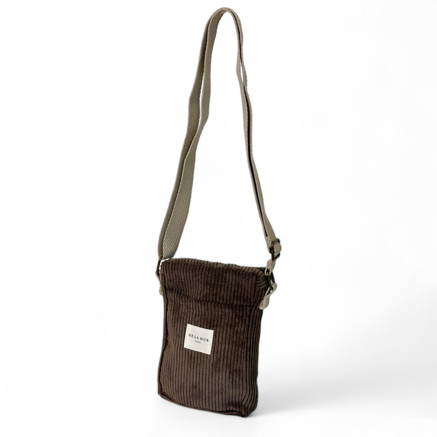 Bolso porta móvil para llevar tipo bandolera, con cremallera en la parte superior y asa larga ajustable de cinta de espiga de algodón de color beige. Bolsillo sin cremallera en la parte exterior. Con tejido grueso de pana marrón. Forrado de tejido grueso de color gris en la parte interior. Para su correcto mantenimiento se aconseja lavarlo en frío a mano y no utilizar secadora.