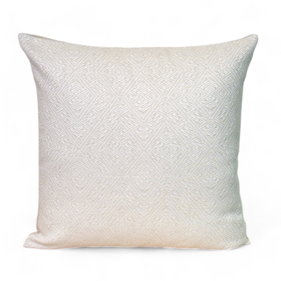 Funda de cojín sin relleno. Combinado con dos tejidos, un tejido grueso de jacquard con estampado geométrico de color crudo por una cara, y otro de color liso beige por la otra. Para su correcto mantenimiento se aconseja lavarlo en frío y no utilizar secadora.