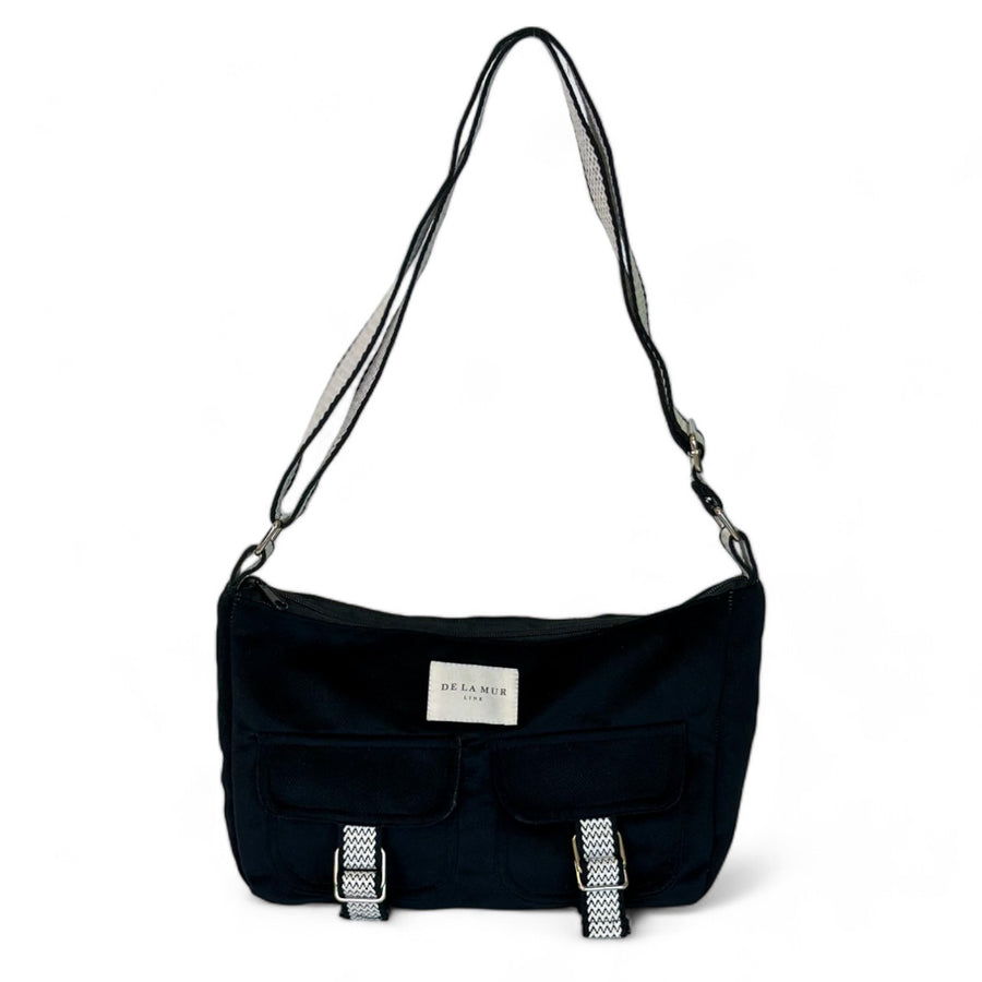 Bolso bolsillos solapa tipo bandolera con asa larga ajustable de cinta de espiga de algodón con estampado tipo zigzag de color blanco y negro. Con un tejido grueso de terciopelo negro. Cierre superior con cremallera. Dos bolsillos delanteros con solapa cerrados con cinta y hebilla. Forrado de tejido grueso de color gris en la parte interior. Bolsillo interior con cremallera. Para su correcto mantenimiento se aconseja lavarlo en frío a mano y no utilizar secadora.