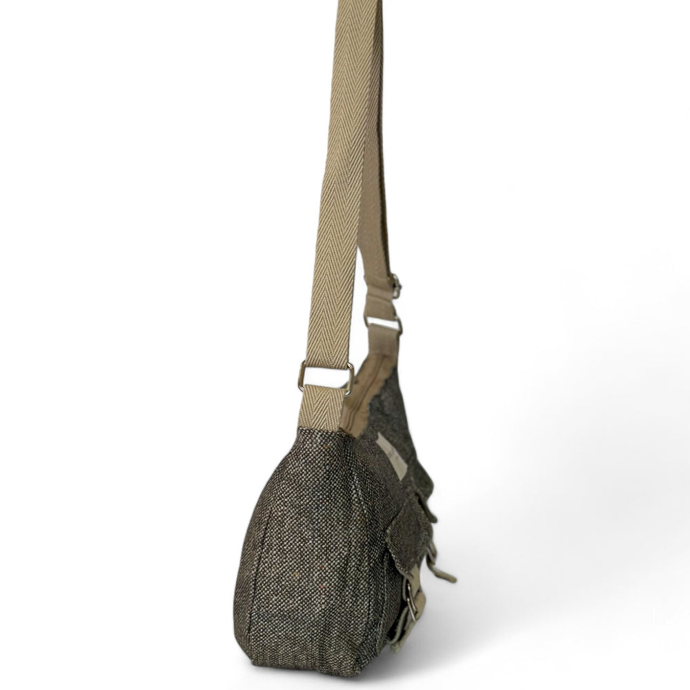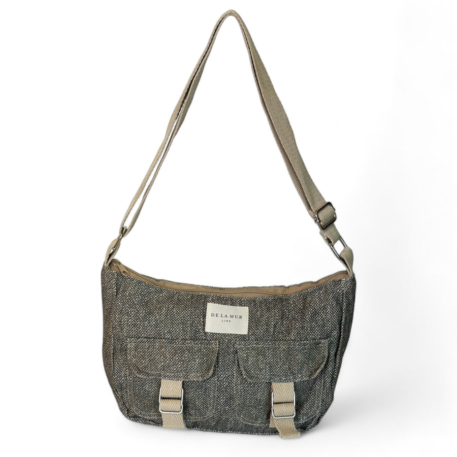 Bolso bolsillos solapa tipo bandolera con asa larga ajustable de cinta de espiga de algodón de color beige. Con un tejido fino con estampado tipo saco de color caqui oscuro. Cierre superior con cremallera. Dos bolsillos delanteros con solapa cerrados con cinta y hebilla. Forrado de tejido grueso de color gris en la parte interior. Bolsillo interior con cremallera. Para su correcto mantenimiento se aconseja lavarlo en frío a mano y no utilizar secadora.