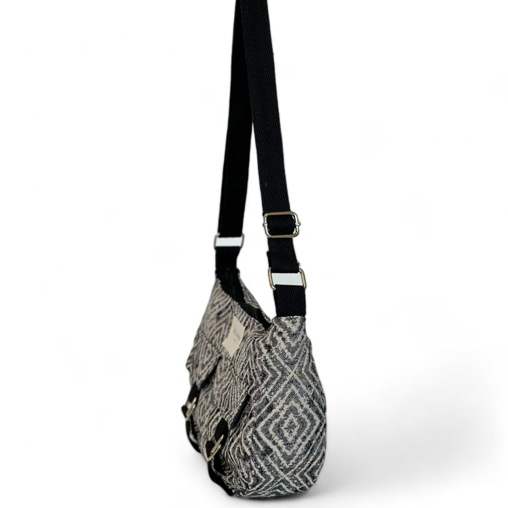 Bolso bolsillos solapa tipo bandolera con asa larga ajustable de cinta de espiga de algodón de color negro. Con un tejido grueso de jacqaurd con estampado geométrico en tonos gris oscuro. Cierre superior con cremallera. Dos bolsillos delanteros con solapa cerrados con cinta y hebilla. Forrado de tejido grueso de color gris en la parte interior. Bolsillo interior con cremallera. Para su correcto mantenimiento se aconseja lavarlo en frío a mano y no utilizar secadora.