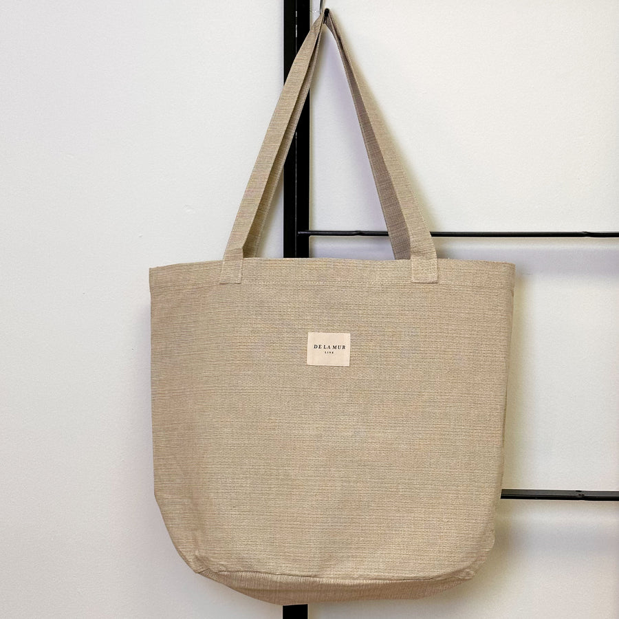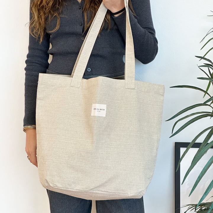 Bolsa shopper grande con asas para llevar al hombro. Con un tejido liso beige. Para su correcto mantenimiento se aconseja lavarlo en frío a mano y no utilizar secadora.