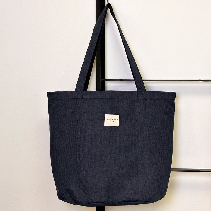 Bolsa shopper grande con asas para llevar al hombro. Con tejido liso de color azul marino. Para su correcto mantenimiento se aconseja lavarlo en frío a mano y no utilizar secadora.