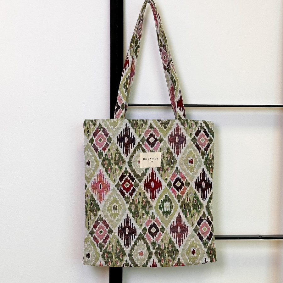 Bolsa “tote bag” con asas para llevar al hombro. Con un tejido con estampado geométrico multicolor. Para su correcto mantenimiento se aconseja lavarlo en frío y no utilizar secadora.